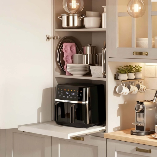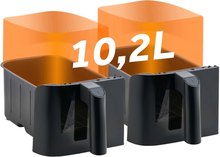 Készítse el egyszerre a főfogást és a köretet. A két, egyenként 5,1 l-es kosár ablakokkal és LED világítással teljes ellenőrzést ad a fiókok kinyitása nélkül – gyorsabban, tisztábban, hatékonyabban.