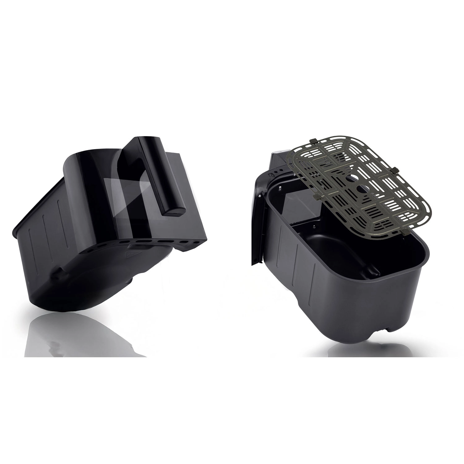 A BERDSEN BD-657 a teljesítményt, a kapacitást és az okos funkciókat elegáns fekete kivitelben egyesíti. A két független zóna lehetővé teszi különböző ételek – például hasábburgonya és csirke – egyidejű elkészítését külön állítható idővel és hőmérséklettel egészen 200 °C-ig. A tapadásmentes PTFE felület és a mosogatógépben mosható alkatrészek erőfeszítés nélküli tisztítást garantálnak.