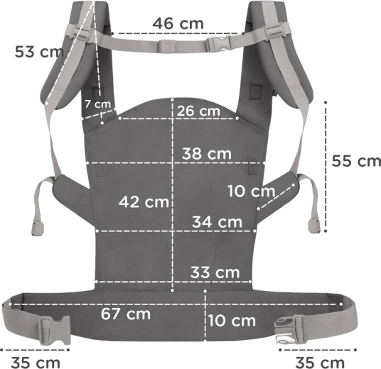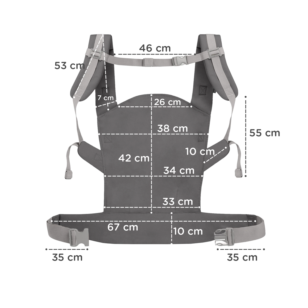 Az innovatív panel magassága és az ülés szélessége fokozatmentesen állítható, együtt nő a gyermekkel. 3 hónapos kortól 20 kg-ig alkalmas, elöl és háton hordozáshoz.