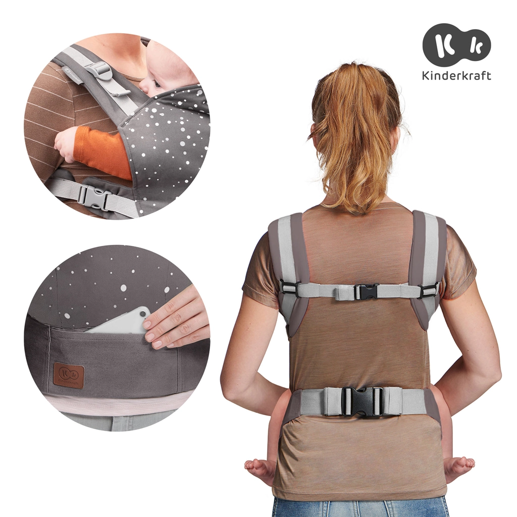 A Kinderkraft Nino hordozót a biztonság, az ergonómia és a kényelem jegyében tervezték szülők és gyermekek számára egyaránt. Az innovatív, fokozatmentesen állítható magasságú panel a gyermek növekedéséhez igazítható, míg a széles, puha deréköv és a párnázott vállpántok kényelmes teherelosztást biztosítanak. A légáteresztő 100% pamut kellemes szellőzést nyújt hosszabb hordozás közben is.