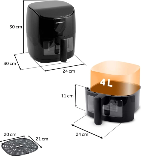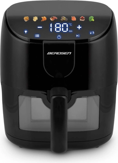 Szereti a ropogós hasábburgonyát és a szaftos húst felesleges olaj nélkül? Ez a BERDSEN forrólevegős fritőz 4 literes űrtartalommal a forró levegő keringetését használja az egyenletes átsüléshez – kívül aranybarna, ropogós, belül szaftos. Ideális családoknak és pároknak, és a LED világítású ablaknak köszönhetően megszakítás nélkül ellenőrizheti a folyamatot.