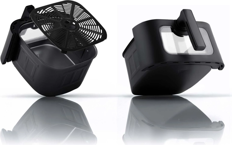 A kivehető kosár és a perforált tálca mosogatógépben mosható. A PTFE tapadásmentes felületek megkönnyítik a tisztítást és javítják a forró levegő áramlását.