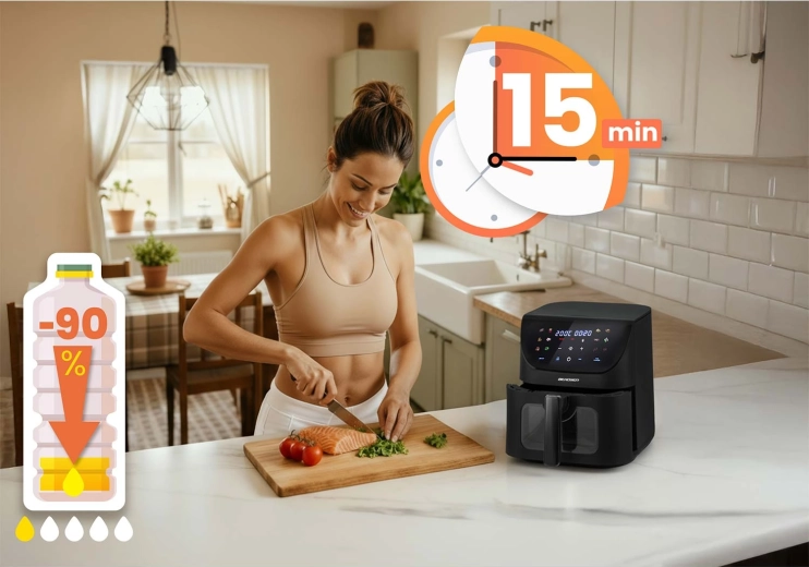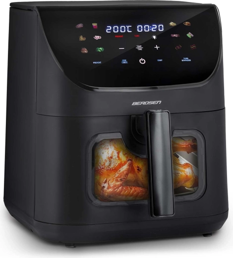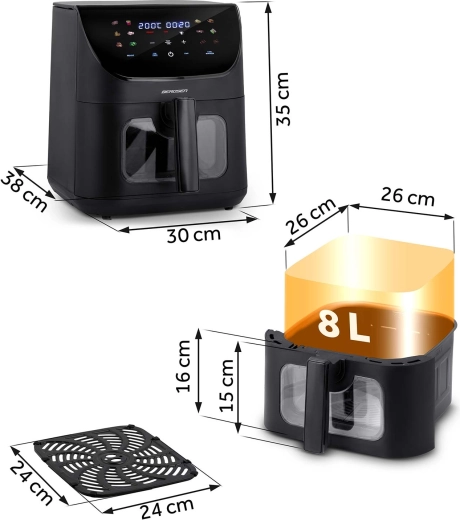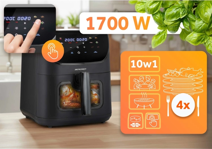 A BERDSEN modern technológiát és praktikusságot hoz a konyhájába. A 8 literes nagy kapacitásnak köszönhetően könnyedén elkészítheti a családi ebédet, egy egész csirkét vagy egy nagy adag sült krumplit a barátoknak. A 80–200 °C közötti hőmérséklet-szabályozás és az 1–60 perces időzítő pontos eredményeket biztosít találgatás nélkül. Az érintéses vezérlőpanel áttekinthető ikonokkal és az LED háttérvilágítású ablak teljes kontrollt ad az elkészítés felett.