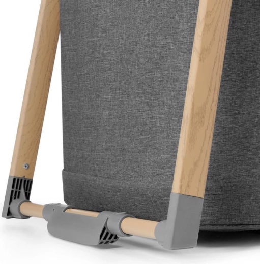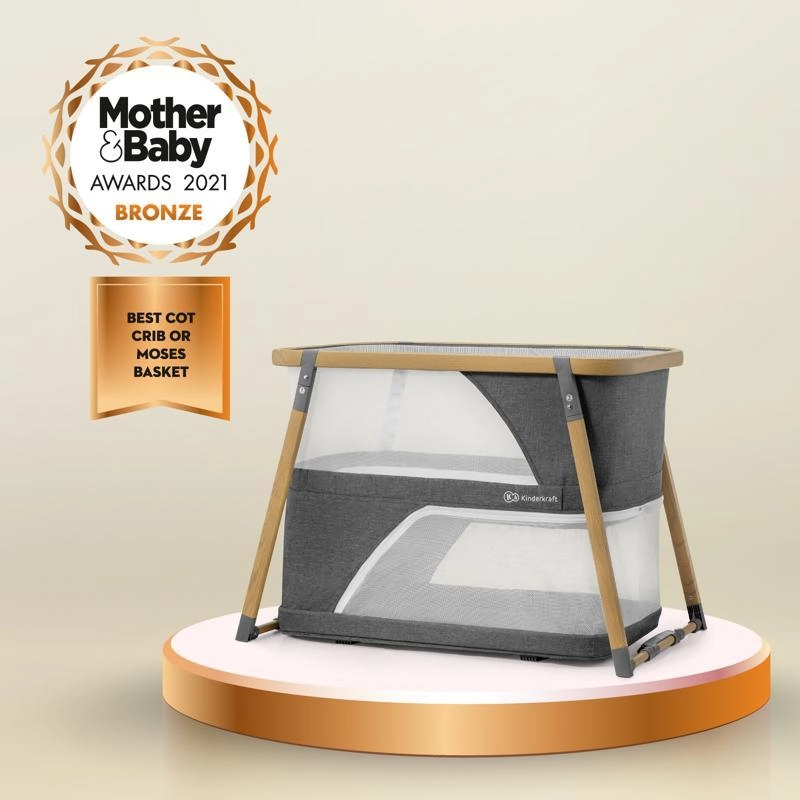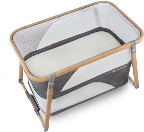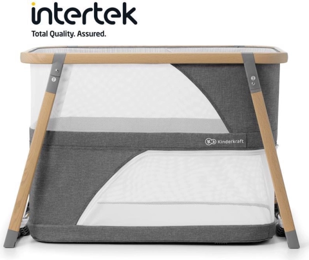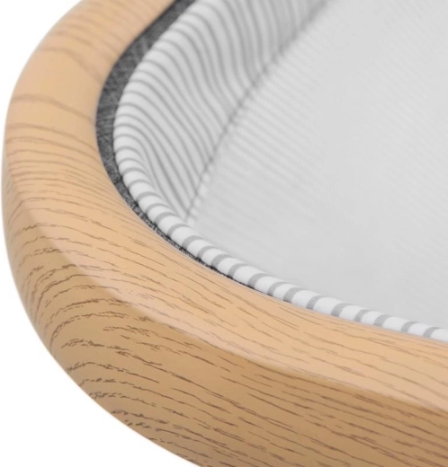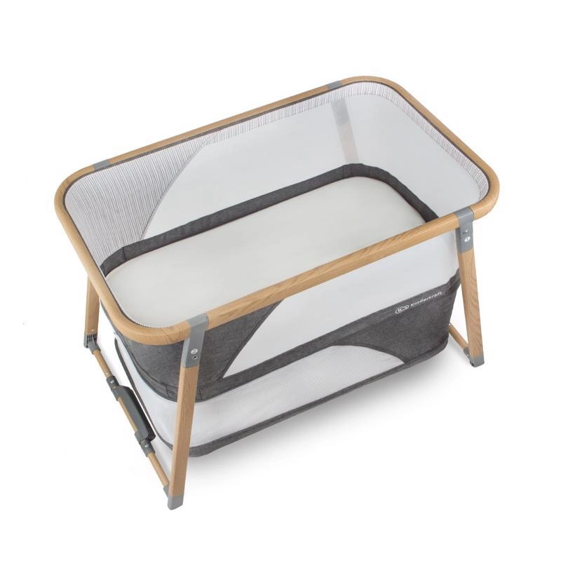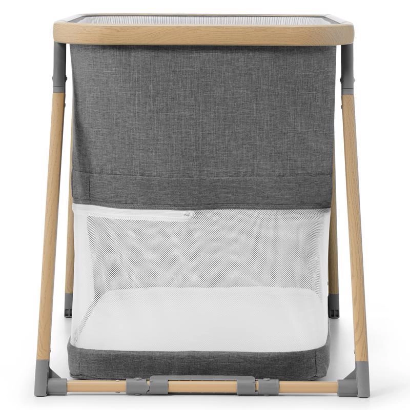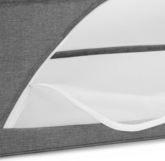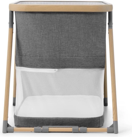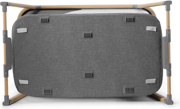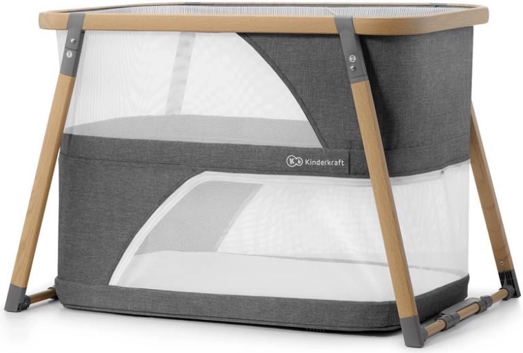 A hálós panelek támogatják a levegőáramlást és lehetővé teszik a vizuális kapcsolatot a babával, míg a fahatású dekorral ellátott alumínium váz stabilitást biztosít.