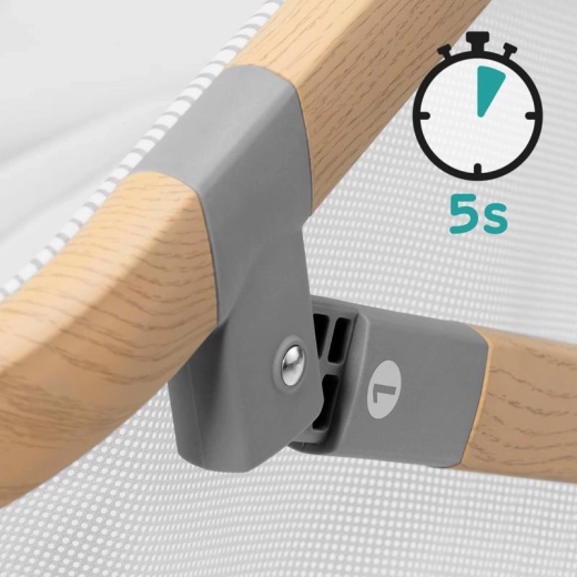 A könnyű, fahatású dekorral ellátott alumíniumszerkezet stabilitást és alacsony tömeget biztosít, így utazáshoz is kiváló. A gyors, szerszám nélküli összecsukás és kinyitás időt takarít meg – 5 másodperc alatt kész. A csomag része a minőségi, ruganyos és tartós habmatrac, valamint egy praktikus hordtáska. A Sofi elnyerte a Kid’s Time 2019 vásár díját.