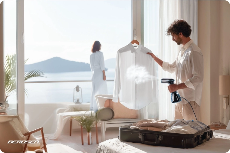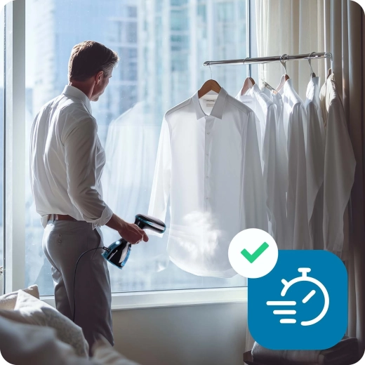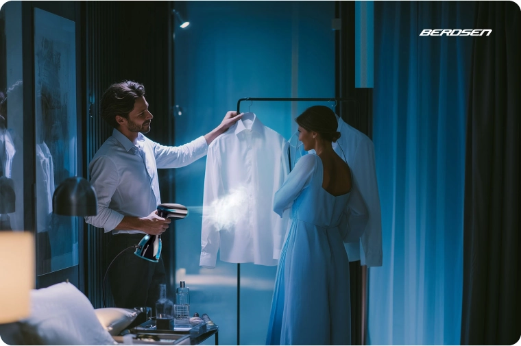 Nem kell többé elővenni a deszkát és hosszan várakozni. A BERDSEN kézi ruhagőzölő már 1 perc alatt kisimítja az inget közvetlenül a vállfán. A 32 g/perc gőzkibocsátásnak köszönhetően a makacsabb gyűrődésekkel is megbirkózik, míg a 280 ml-es tartály hosszabb, megszakítás nélküli működést biztosít. A praktikus, megvilágított gomb megkönnyíti a kezelést, a száraz vasalás funkció pedig az anyagtól függően bővíti a felhasználási lehetőségeket.