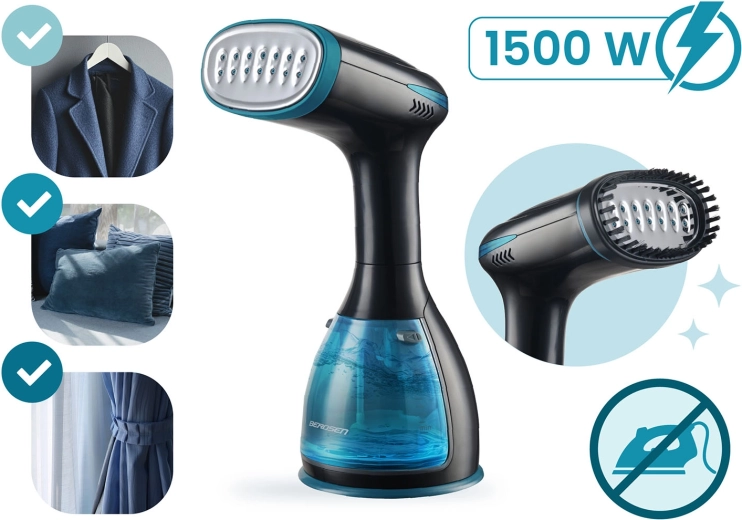 A nagy teljesítményű és stílusos BERDSEN kézi gőzölő 1500 W teljesítménnyel gyorsan és kíméletesen kisimítja a gyűrődéseket vasalódeszka nélkül. Erős, 32 g/perc gőzkibocsátást, nagy, kivehető 280 ml-es tartályt, egyszerű, egyetlen megvilágított gombbal történő vezérlést és tartozékokat kínál a csomagban. A gőz hatékonyan felfrissíti a textíliákat, segít csökkenteni a baktériumok és atkáK számát, és ideális kárpitra vagy kabátokra is.
