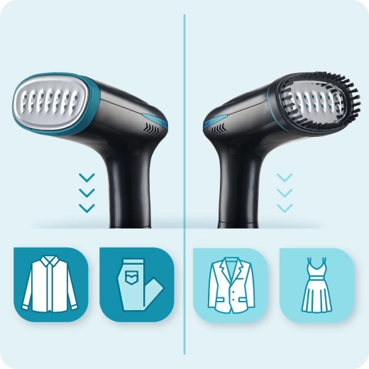 A magas hőmérsékletű gőz segít a textíliák higiénikus felfrissítésében – vegyszerek és felesleges nedvesség nélkül. Otthonra és utazáshoz egyaránt ideális: a kompakt ház kisebb bőröndbe is belefér. A kefés feltéttel egyszerre kisimíthatja és kifésülheti a szálakat és bolyhokat a kabátokról vagy kárpitról.