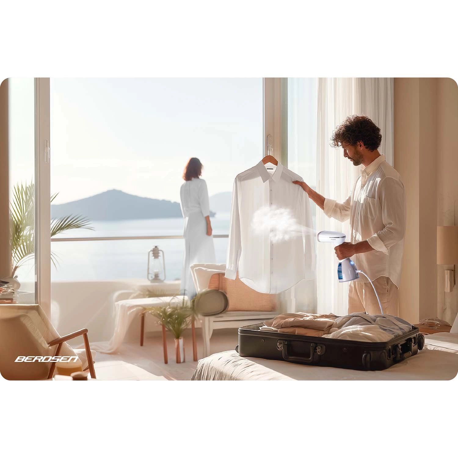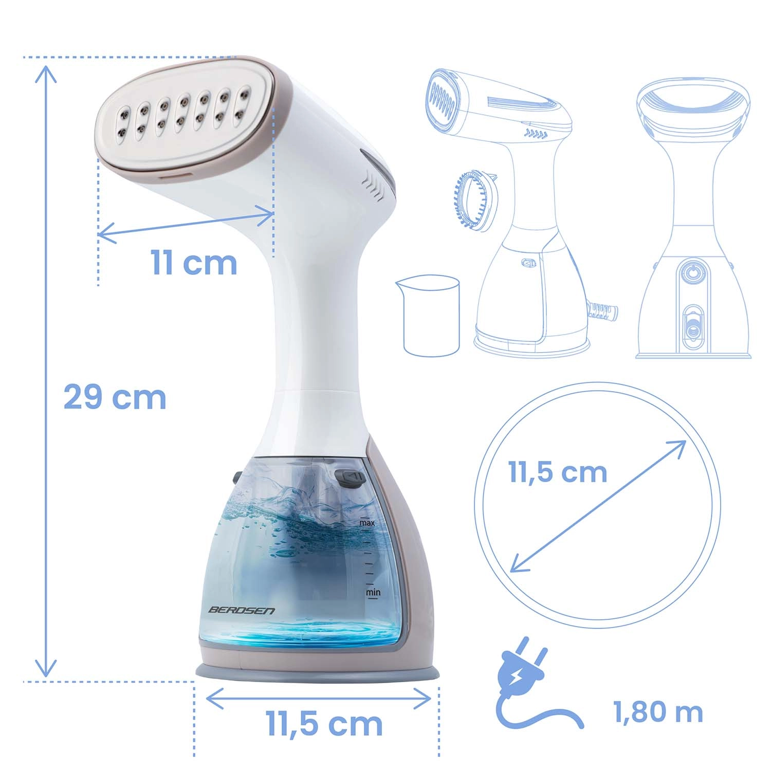 Erős, kézi ruhagőzölő 1500 W a BERDSEN márkától, amely gyorsan kisimítja a gyűrődéseket, felfrissíti a textileket, és segít eltávolítani a baktériumokat és atkákat vegyszerek nélkül. Erőteljes gőzkibocsátást, akár 32 g/perc teljesítményt kínál, nagy, kivehető 280 ml-es tartállyal, egyetlen, háttérvilágított gombbal történő egyszerű vezérléssel és praktikus tartozékokkal – kefés fej és kiöntő adapter. Ideális gyors vállfás vasaláshoz és kárpitok felfrissítéséhez.