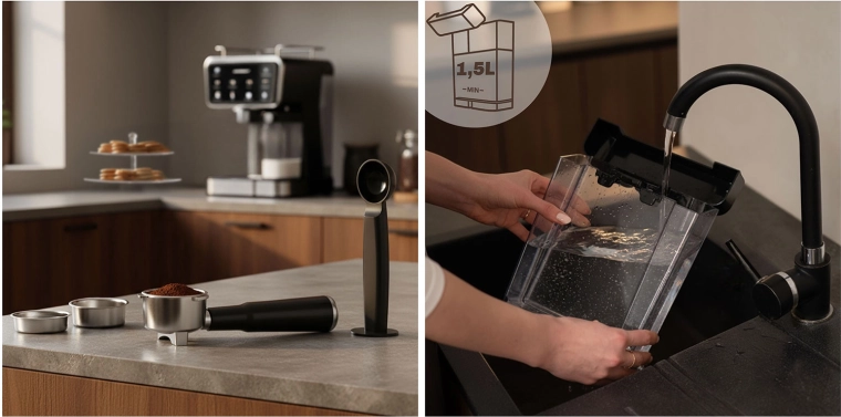 A praktikus felszereltséghez tartozik a levehető 1,5 l-es víztartály, a 0,5 l-es tejtartály, a kivehető csepptálca és a halk működés. Az AUTO CLEAN program egy érintéssel kitisztítja a készüléket és a tejjáratot is. A Cold/Cool espresso funkció ideális alap jeges lattéhoz, espresso tonic-hoz vagy nyári mochaccinóhoz – várakozás és turmixgép nélkül.