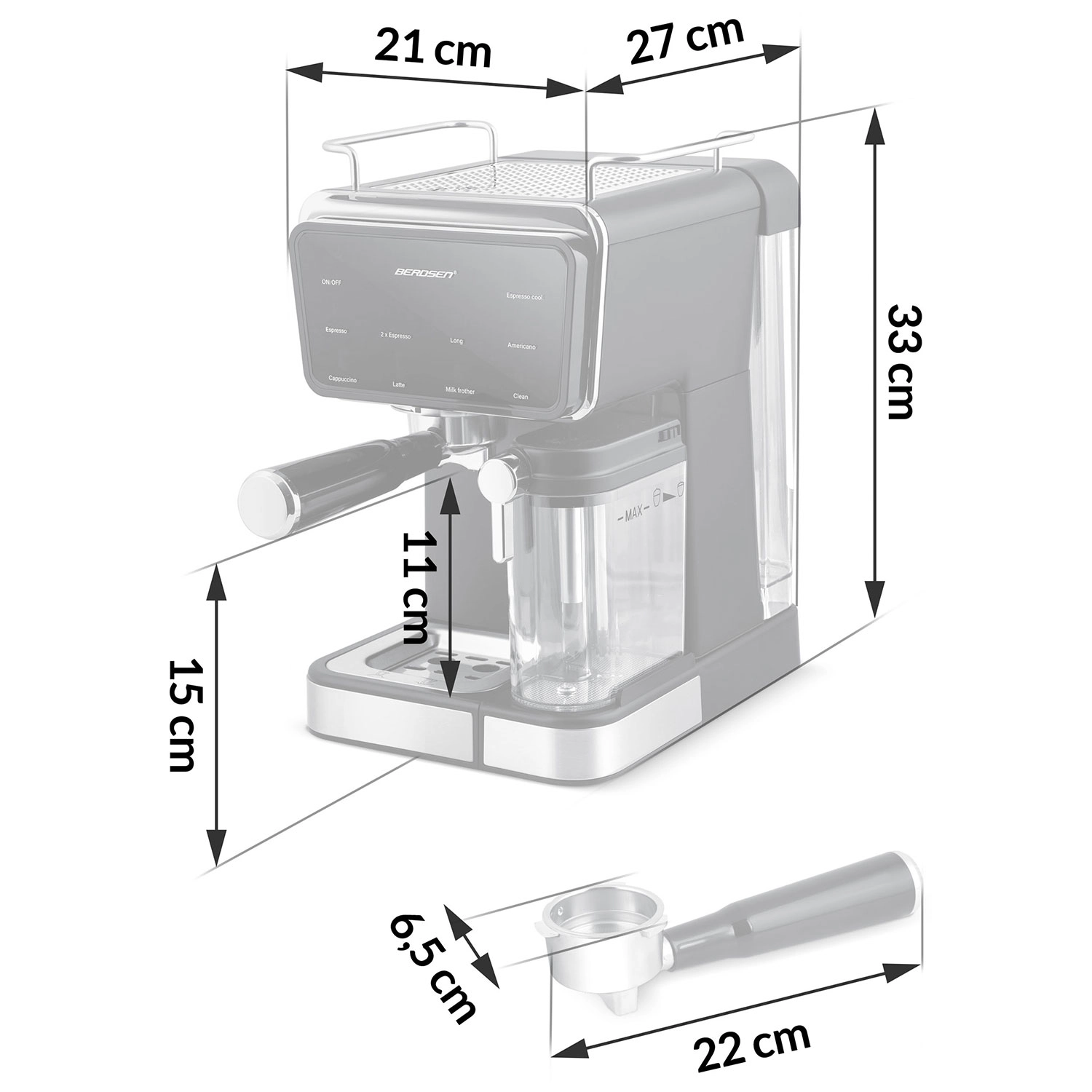 - Professzionális tartozékok: masszív kar, két rozsdamentes szűrőkosár (single/double), dupla kifolyó, 2 az 1-ben adagoló tamperrel.