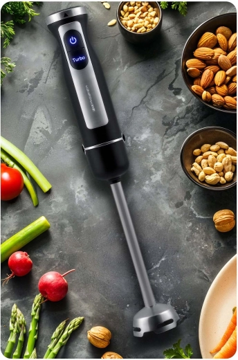 Fedezze fel a konyha univerzális segítőjét: a Berdsen botmixert a rendkívül erős, 1500 W-os motorral és a Turbo funkcióval, amely a lágy gyümölcstől a kemény diófélékig mindent könnyedén kezel. A GOLD titán penge hosszú élettartamot, precíz vágást és egyszerű karbantartást biztosít. A 25 sebesség révén könnyedén beállíthatja az ideális teljesítményt levesekhez, szószokhoz, turmixokhoz és pürékhez.