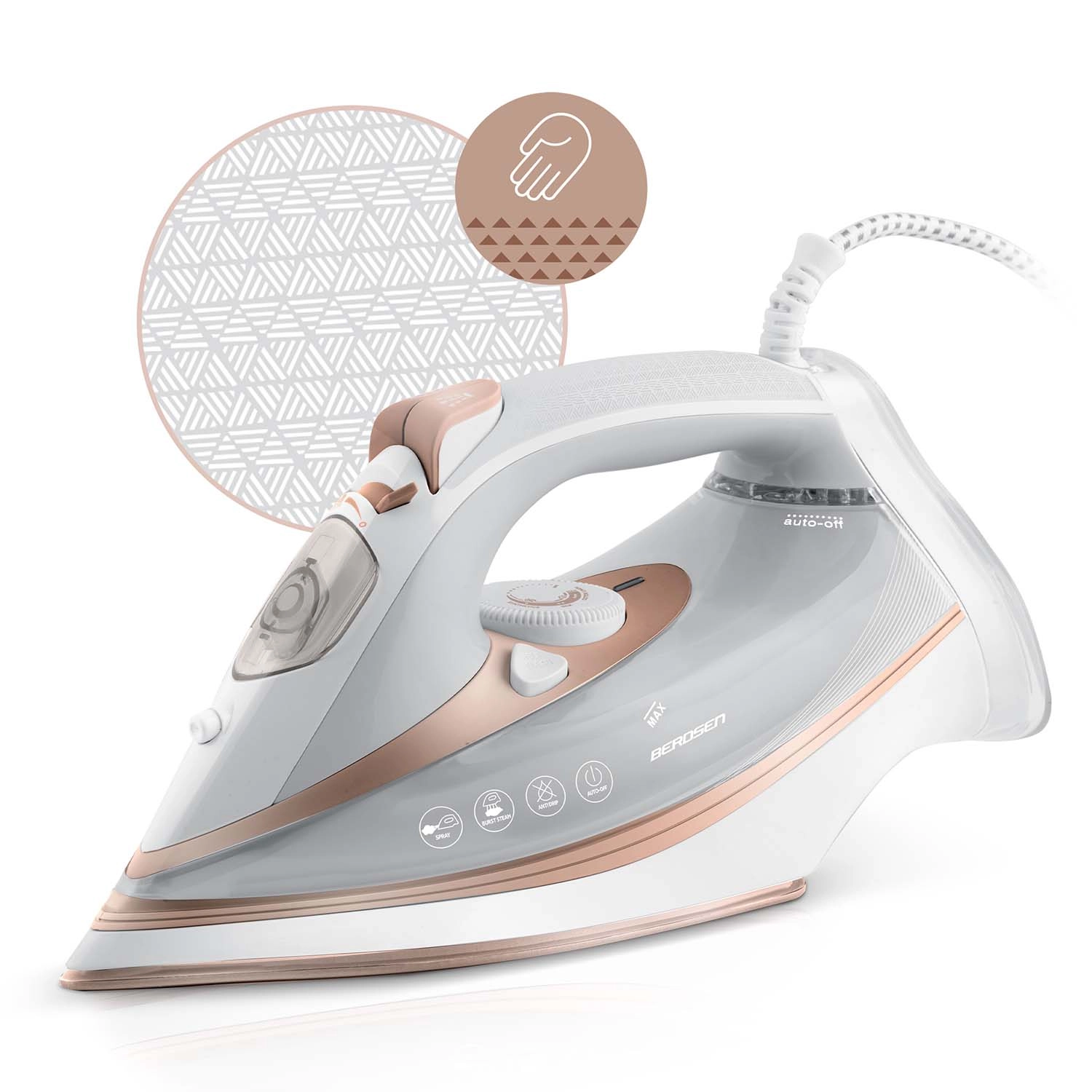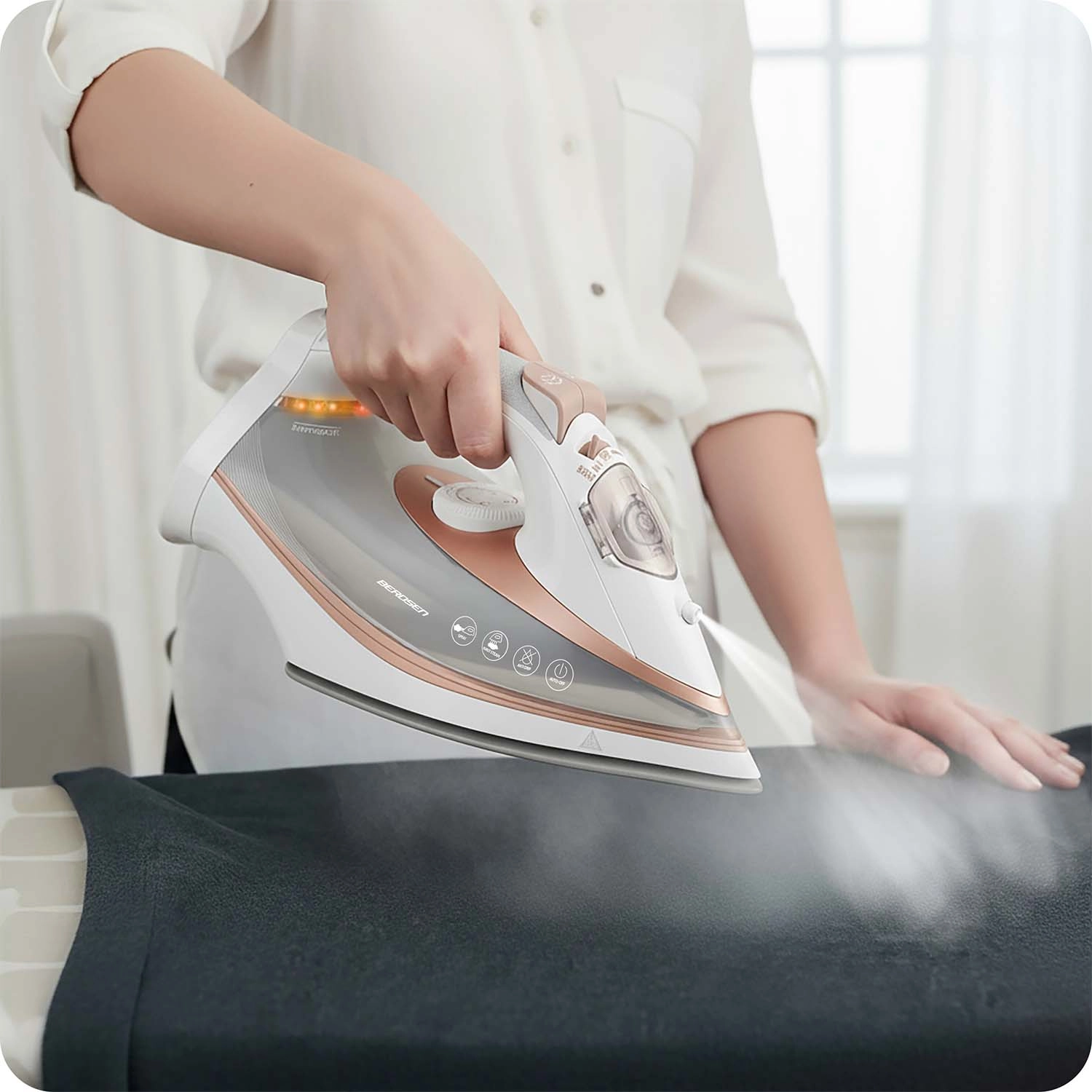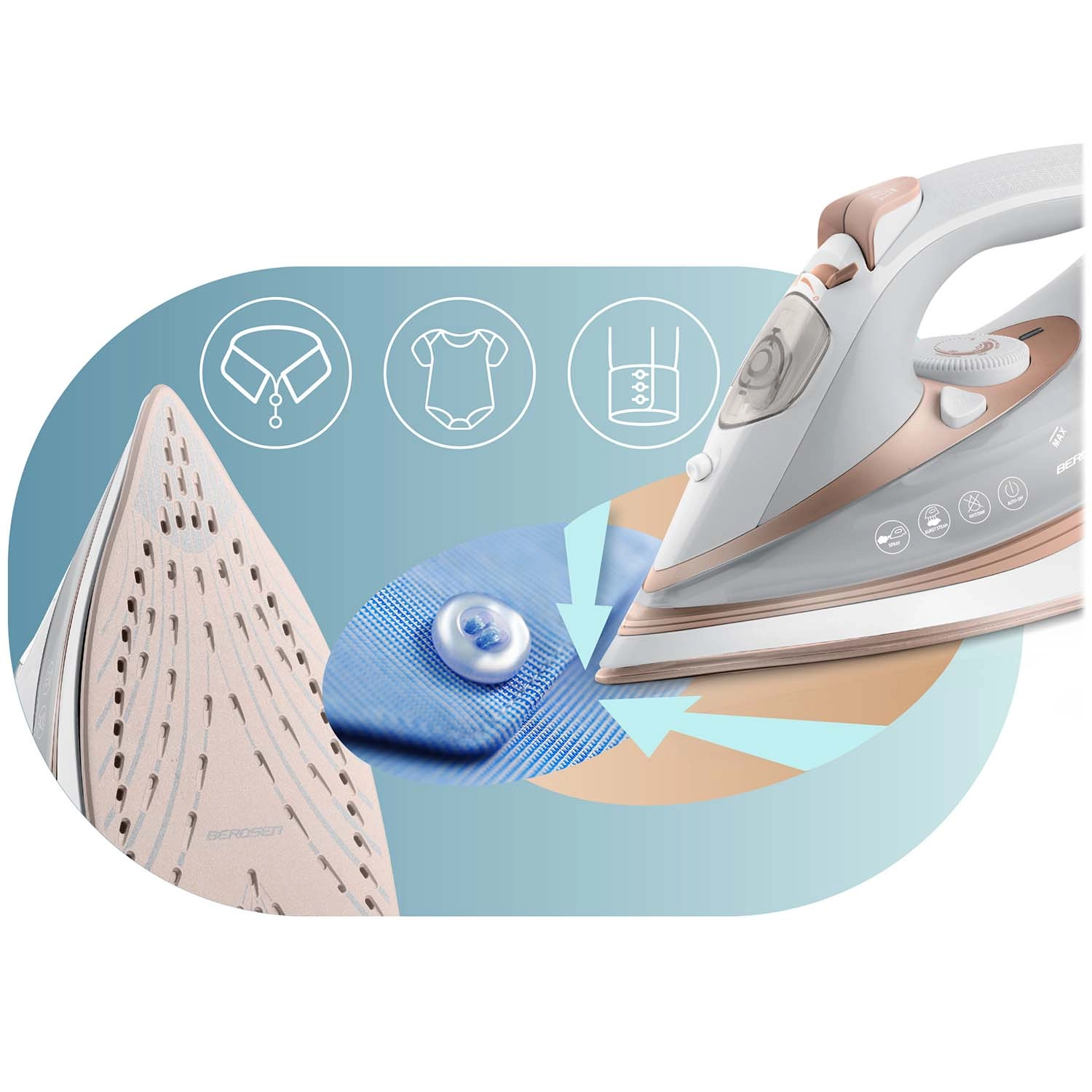 Rövidítse le a vasalódeszkán töltött időt a BERDSEN gőzvasalóval, amely a 3000 W‑os nagy teljesítményt, a gyors felfűtést és a hatékony dupla gőzlöketet ötvözi. A mikrocsatornákkal ellátott kerámia talp egyenletesen oszlatja el a gőzt, simán siklik az anyagon, és könnyedén megbirkózik a problémás helyekkel – gombok, gallérok és mandzsetták környékén.