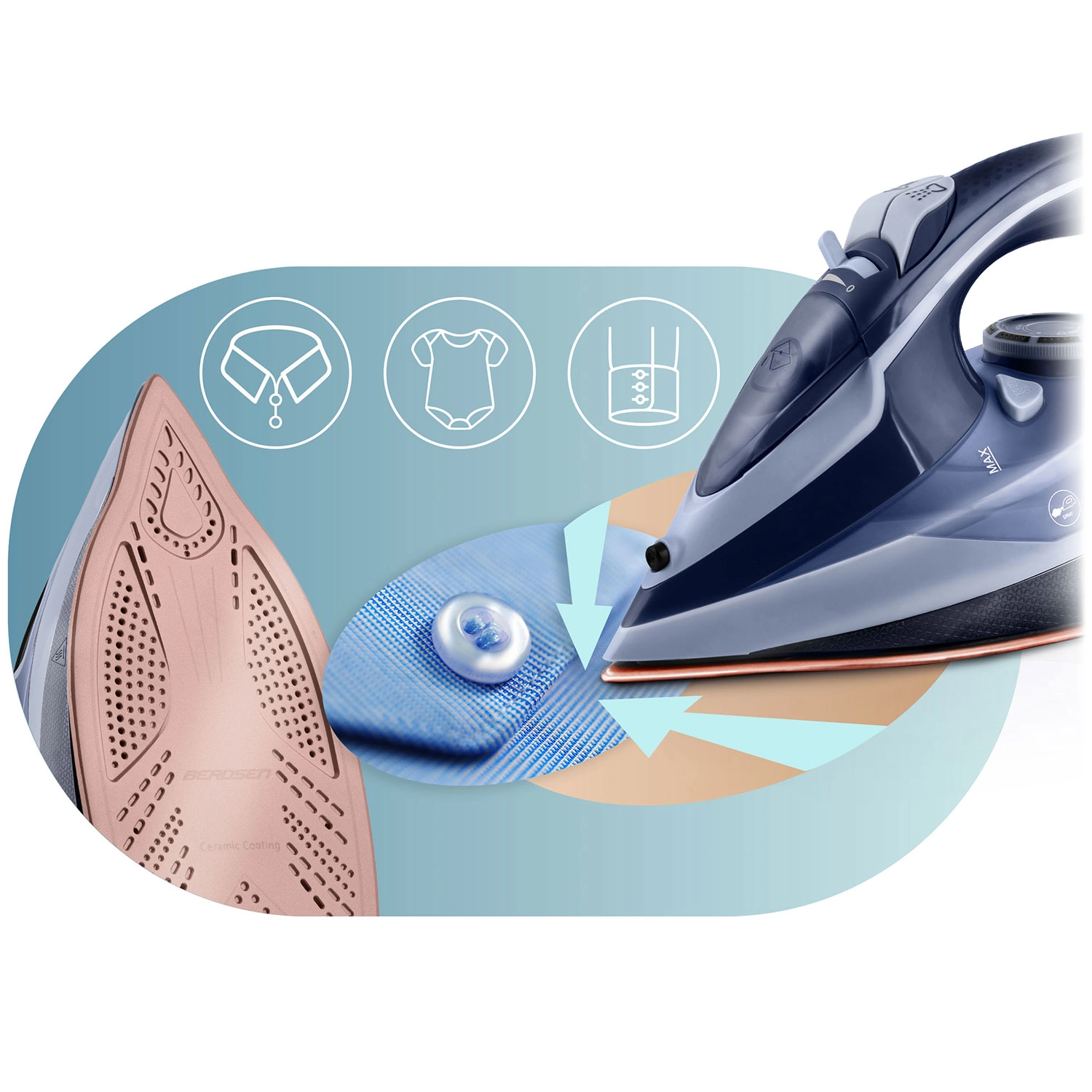 - Kerámia vasalótalp tartós felületkezeléssel – sima siklás, szövetvédelem és precíz csúcs a gombok és gallérok körüli részekhez.