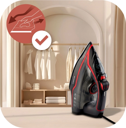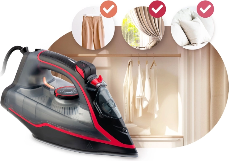 • Gőz- és hőmérséklet-szabályozás – optimális beállítás finom és vastag szövetekhez is.
