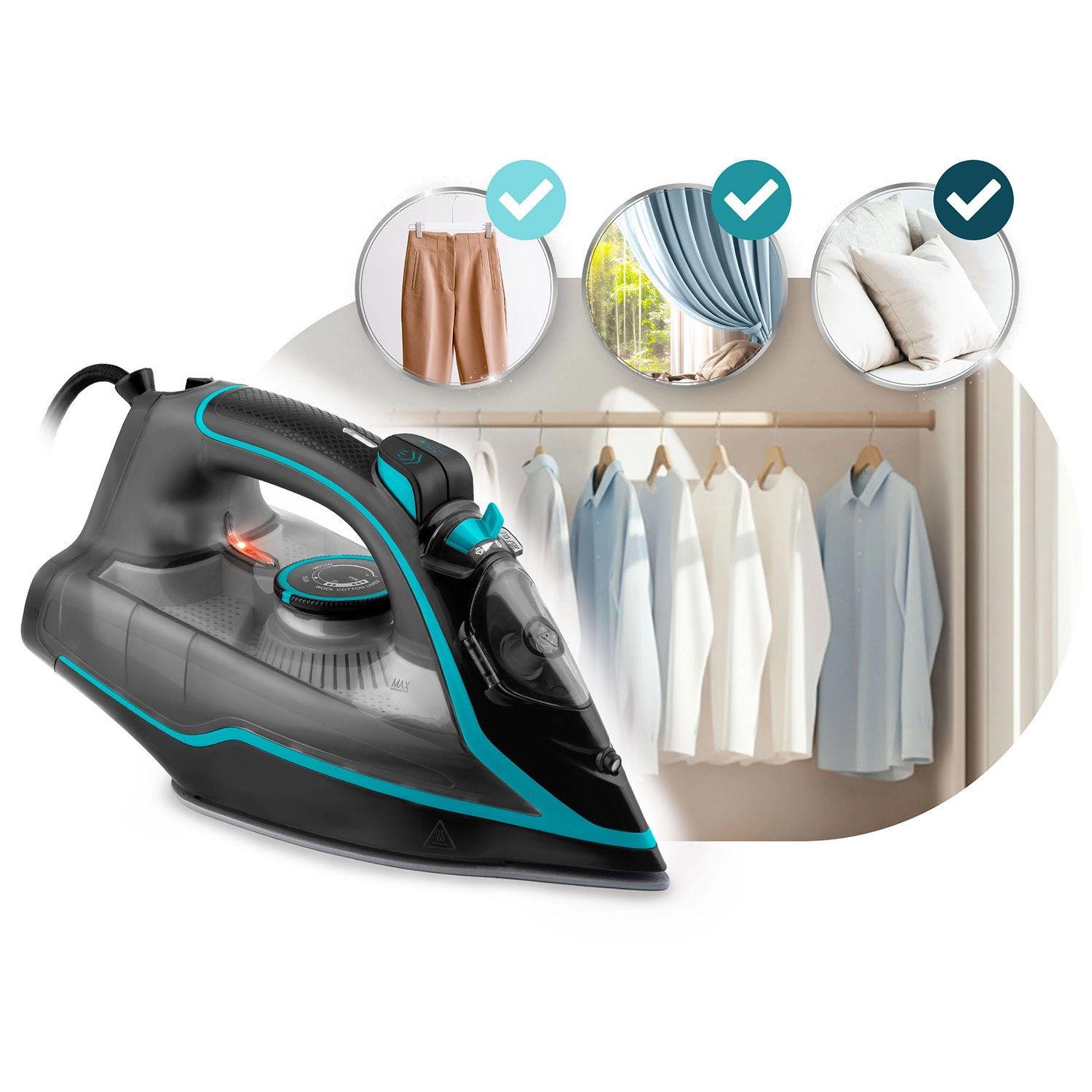 • Gőz- és hőmérséklet-szabályzás – finom és vastag szövetekhez egyaránt.