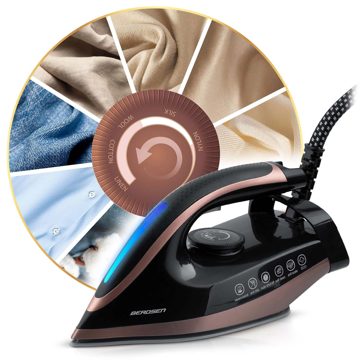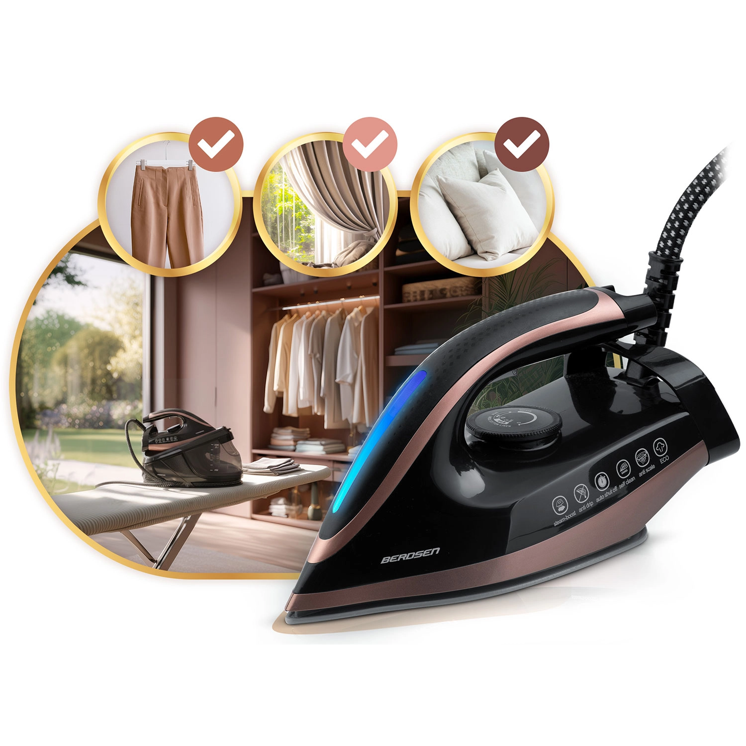 A BERDSEN gőzgenerátor ideális választás azoknak a háztartásoknak, amelyek a magas teljesítményt, a kényelmet és a szövetek kíméletét szeretnék ötvözni. A kiváló siklású, mikrocsatornákkal ellátott kerámia vasalótalp egyenletesen oszlatja el a gőzt, így a makacs gyűrődéseket is eltünteti ingeken, lenvásznon, ágyneműn vagy függönyökön. A nagy, 1,5 l-es tartálynak köszönhetően hosszú ideig vasalhat gyakori utántöltés nélkül.