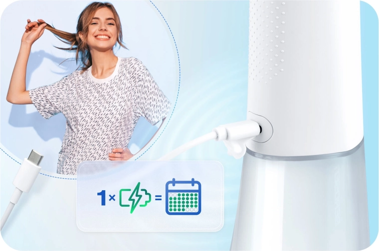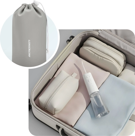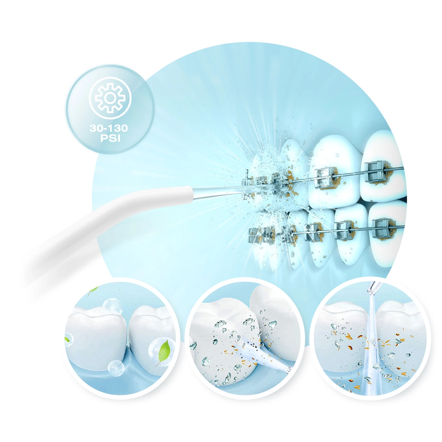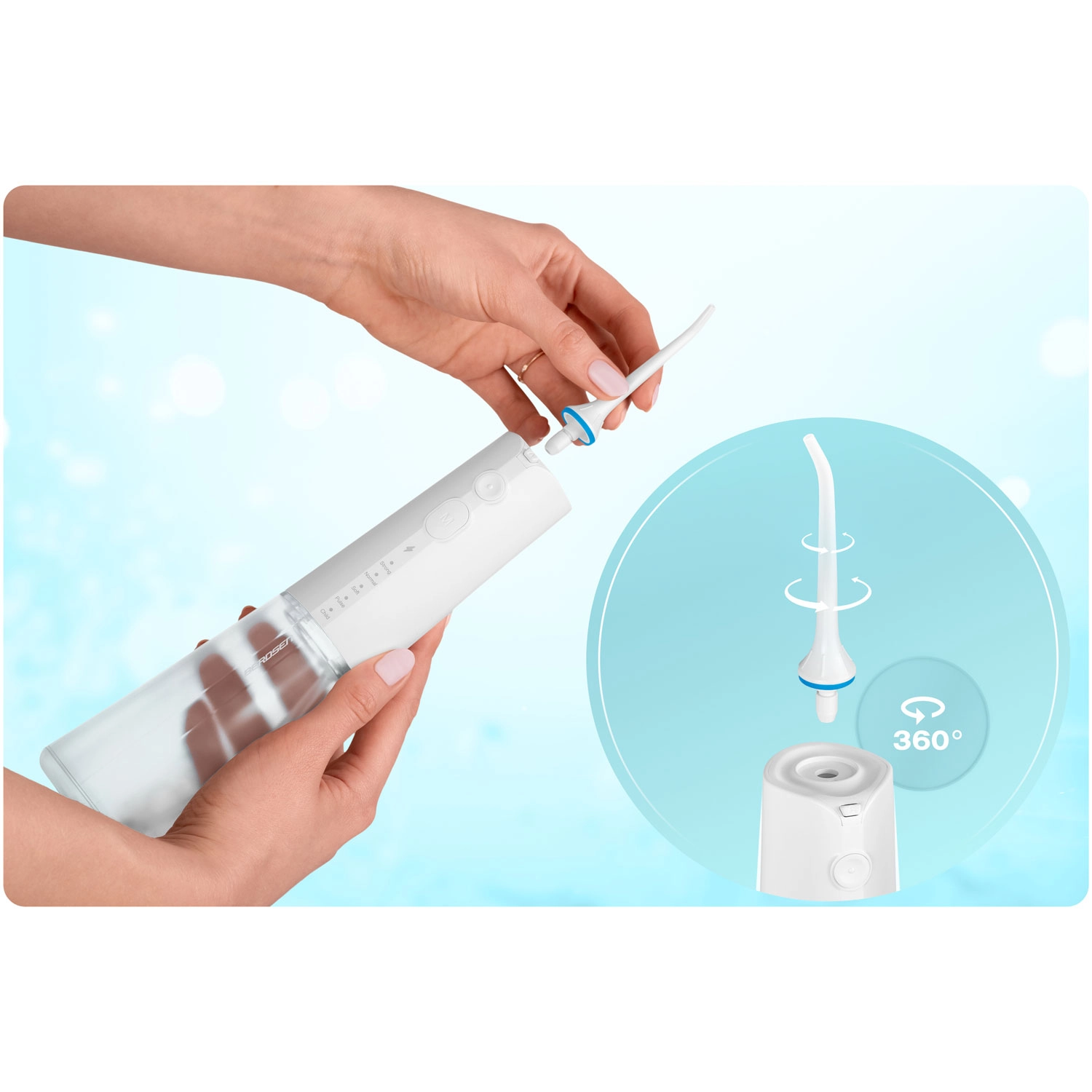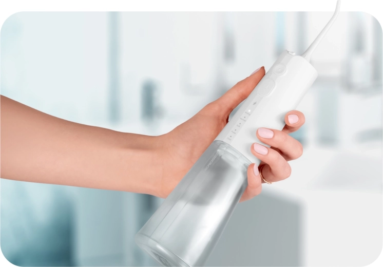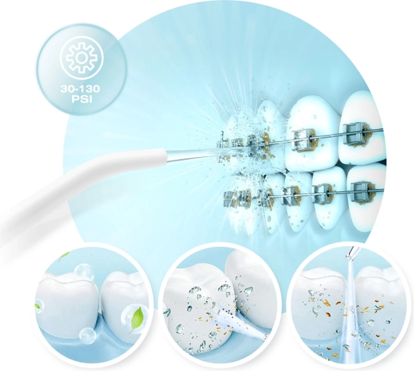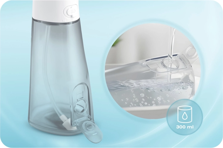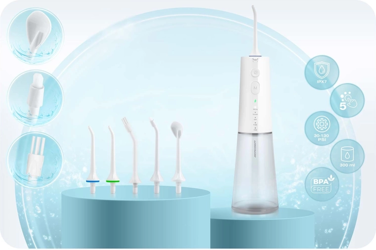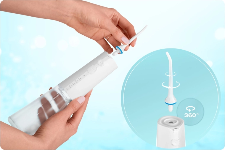 A csomagban öt fúvókát talál a teljes körű szájápoláshoz: standard fejek a mindennapi használathoz, nyelvtisztító a friss leheletért, ortodontikus fúvóka fogszabályzóhoz, valamint speciális fúvóka a parodontális tasakok tisztításához (alacsony nyomáson ajánlott). A 360°-ban forgó fejrész megkönnyíti a száj minden területének elérését, az IPX7 vízállóság pedig növeli a biztonságos használatot a fürdőszobában.