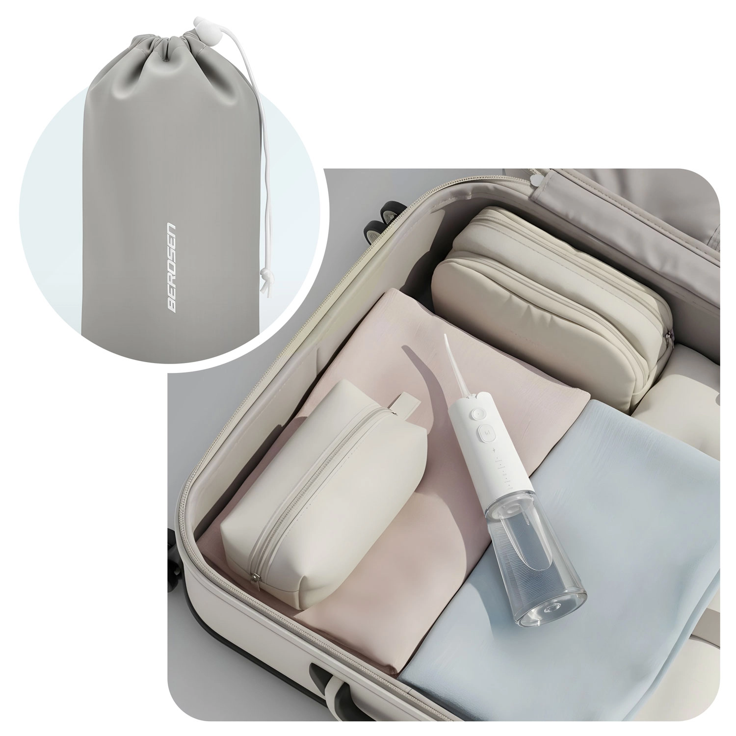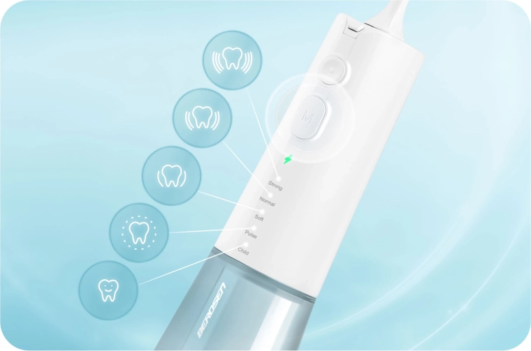 A vezeték nélküli Berdsen szájzuhany hatékonyan távolítja el a szennyeződéseket és az ételmaradékokat a fogközökből és az ínyszegély mentén erős, mégis kíméletes vízsugárral. Az öt üzemmód (Strong, Normal, Soft, Pulse, Child) lehetővé teszi a nyomás és a ritmus személyre szabását az érzékeny ínyhez, fogszabályzót viselőknek és gyermekeknek. A nagyobb, 300 ml-es tartály hosszabb tisztítást biztosít gyakori vízutántöltés nélkül.