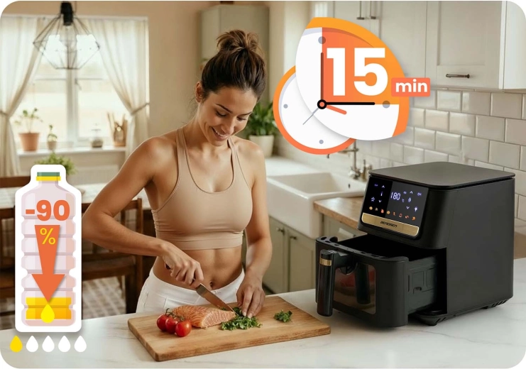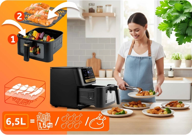 Az XXL kosár elfér benne egy egész mirelit pizza, nagyobb adag hasábburgonya vagy akár egy egész csirke. Ideális a gyors családi vacsorákhoz kompromisszumok nélkül.