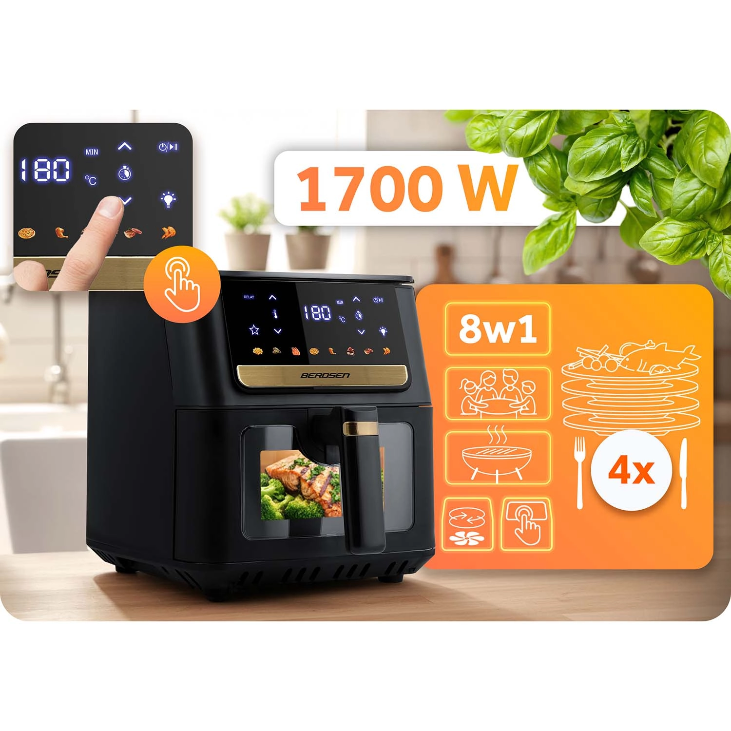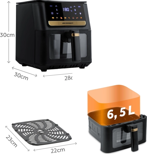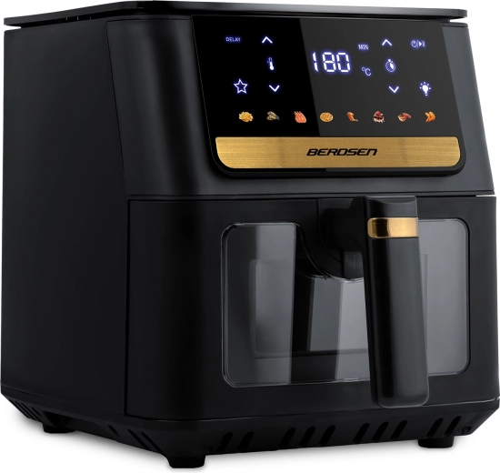 A BERDSEN forrólevegős sütő gyors és egyenletes elkészítést kínál kedvenc ételeihez felesleges olaj nélkül. A nagy, 6,5 l-es kosár családi adagokat is befogad – a hasábburgonyától, csirkeszárnytól és steakektől kezdve egészen az egész csirkéig. Az LED megvilágítás és az átlátszó ablak lehetővé teszi a folyamat figyelését a sütés megszakítása nélkül, míg az érintőkijelző egyértelmű ikonokat és előbeállításokat kínál az egyszerű programválasztáshoz.