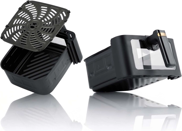 Válasszon a 8 előre beállított üzemmód közül (hasábburgonya, hal, csirke, garnéla, steak, sütemény, pizza, csirkeszárny) vagy állítsa be manuálisan az időt és a hőfokot akár 200 °C-ig. A tapadásmentes kosár és rács PTFE bevonattal megkönnyíti a tisztítást, az alkatrészek mosogatógépben moshatók. A biztonságos működést hőszigetelt kialakítás, hideg érintésű fogantyú, túlmelegedés elleni védelem és automatikus kikapcsolás biztosítja.