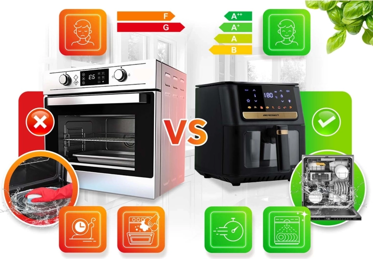 Fedezze fel a kényelmesebb és egészségesebb főzést a BERDSEN forrólevegős sütővel, 6,5 l kapacitással és 1700 W teljesítménnyel. A forró levegő keringetésének köszönhetően akár 90%-kal kevesebb zsírral készíthet ételeket – kívül ropogós, belül szaftos eredménnyel. Élvezze a 8 automatikus programot, az érintőpanelt áttekinthető ikonokkal, az LED megvilágítású ablakot a kosár kinyitása nélküli ellenőrzéshez, és a könnyű tisztítást a tapadásmentes PTFE bevonatnak és a mosogatógépben mosható alkatrészeknek köszönhetően.