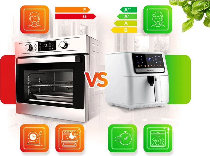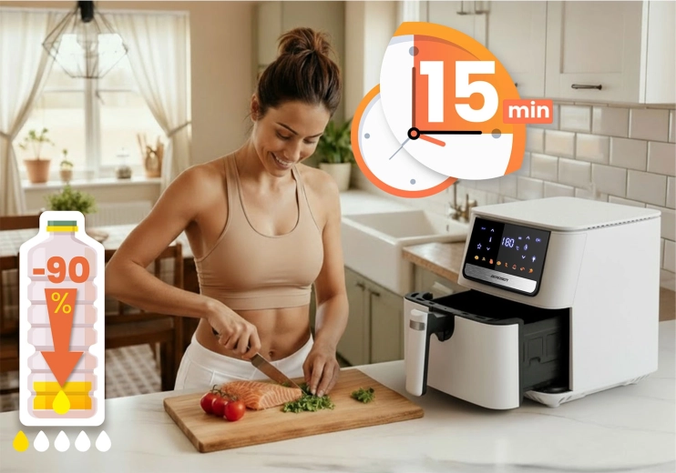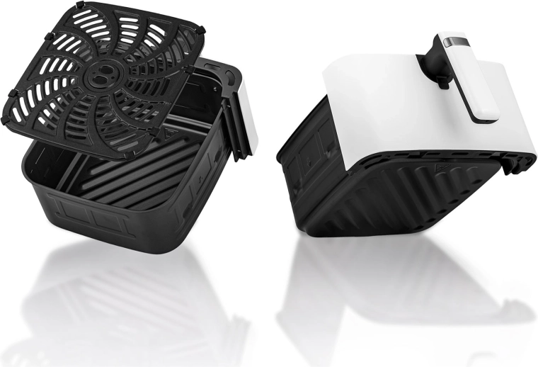 Egyetlen készülék kiváltja a hagyományos fritőzt, a sütőt, a grillt, a melegszendvicssütőt/pirítót, az aszalót és az ételmelegítőt. Nem hiányzik a késleltetett indítás, a rázás/megfordítás emlékeztető, a túlmelegedés elleni védelem és az automatikus kikapcsolás a biztonságos működésért.