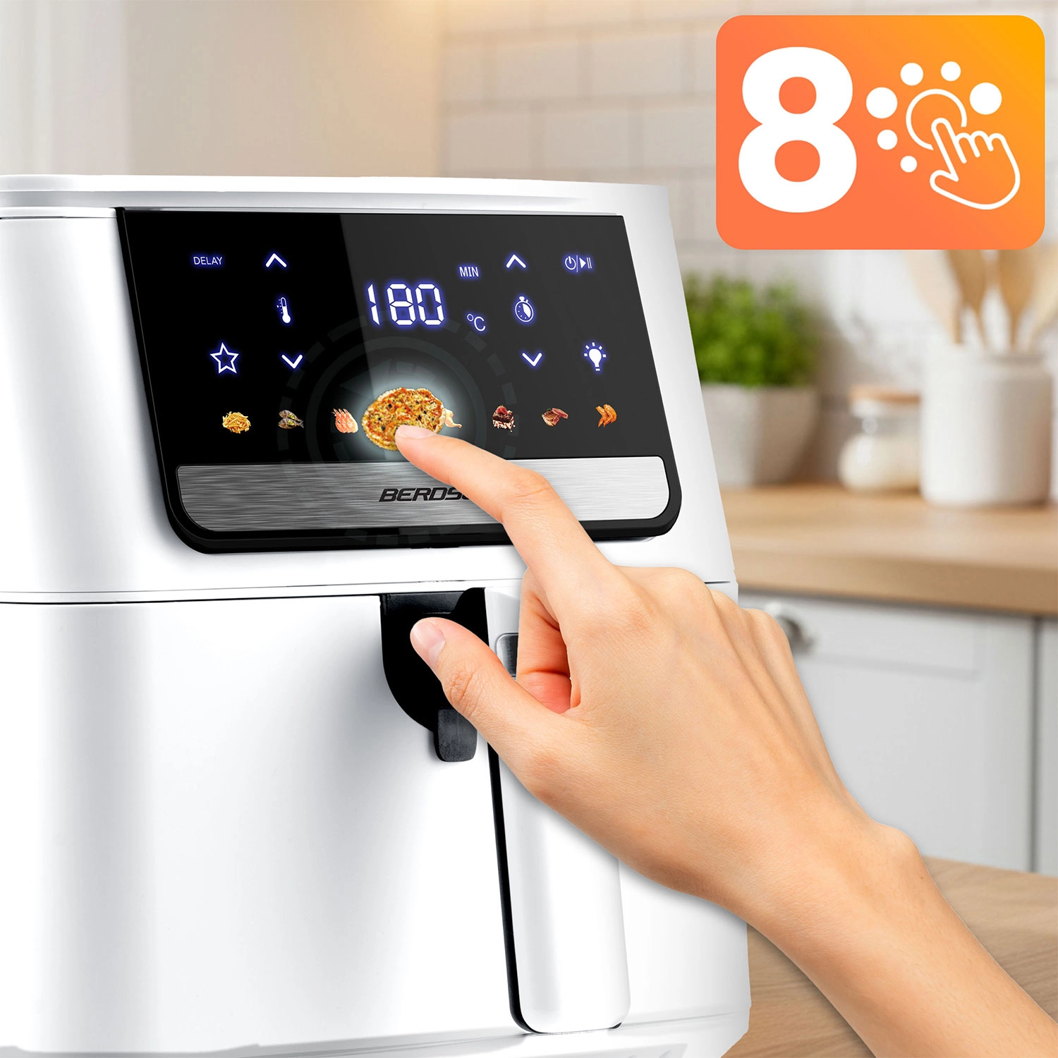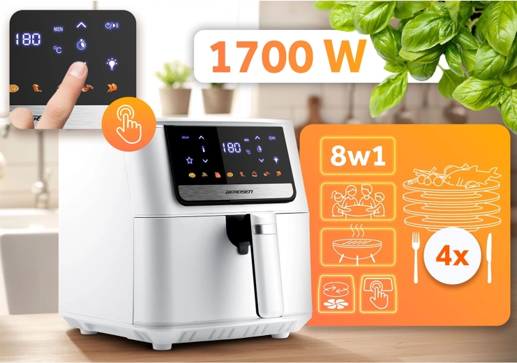 Főzzön egészségesebben anélkül, hogy engedne az ízből. A BERDSEN fritőz modern forrólevegő-keringetést használ a egyenletes és gyors sütéshez anélkül, hogy mélysütésre lenne szükség. Az állítható hőmérséklet egészen 200 °C-ig és az akár 60 perces időzítő tökéletes eredményt biztosít hasábburgonyához, csirkéhez, halhoz, zöldségekhez és pékárukhoz.