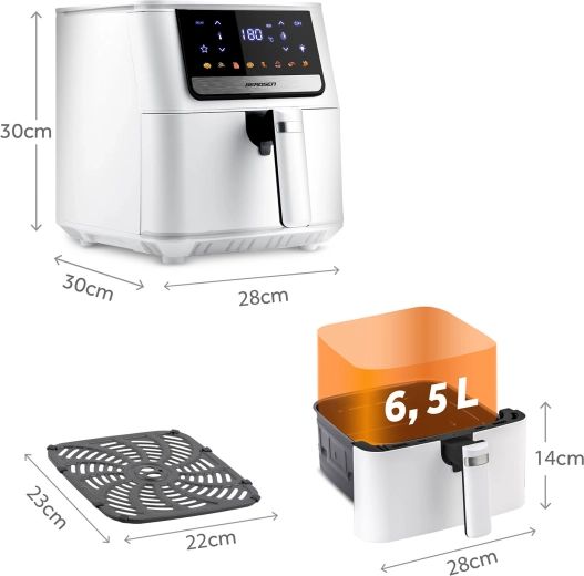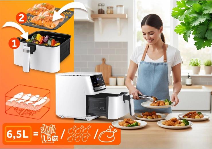 Az intuitív érintőpanel színes ikonokkal és 8 intelligens programmal leegyszerűsíti a kedvenc ételek elkészítését. A nagy, 6,5 l-es kosárba egy egész fagyasztott pizza vagy egy teljes családi ebéd is belefér. A kivehető kosár és a rozsdamentes acél tálca PTFE tapadásmentes bevonattal mosogatógépben mosható – a takarítás gyerekjáték.