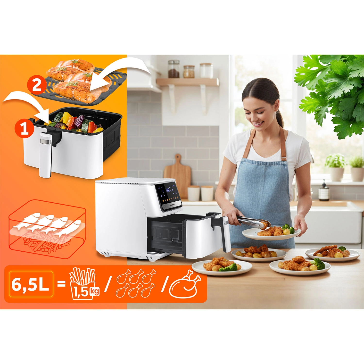 Az XXL térfogat elfér benne egy egész fagyasztott pizza, egy egész csirke vagy több adag köret egyszerre. Ideális családi vacsorákhoz és baráti összejövetelekhez.