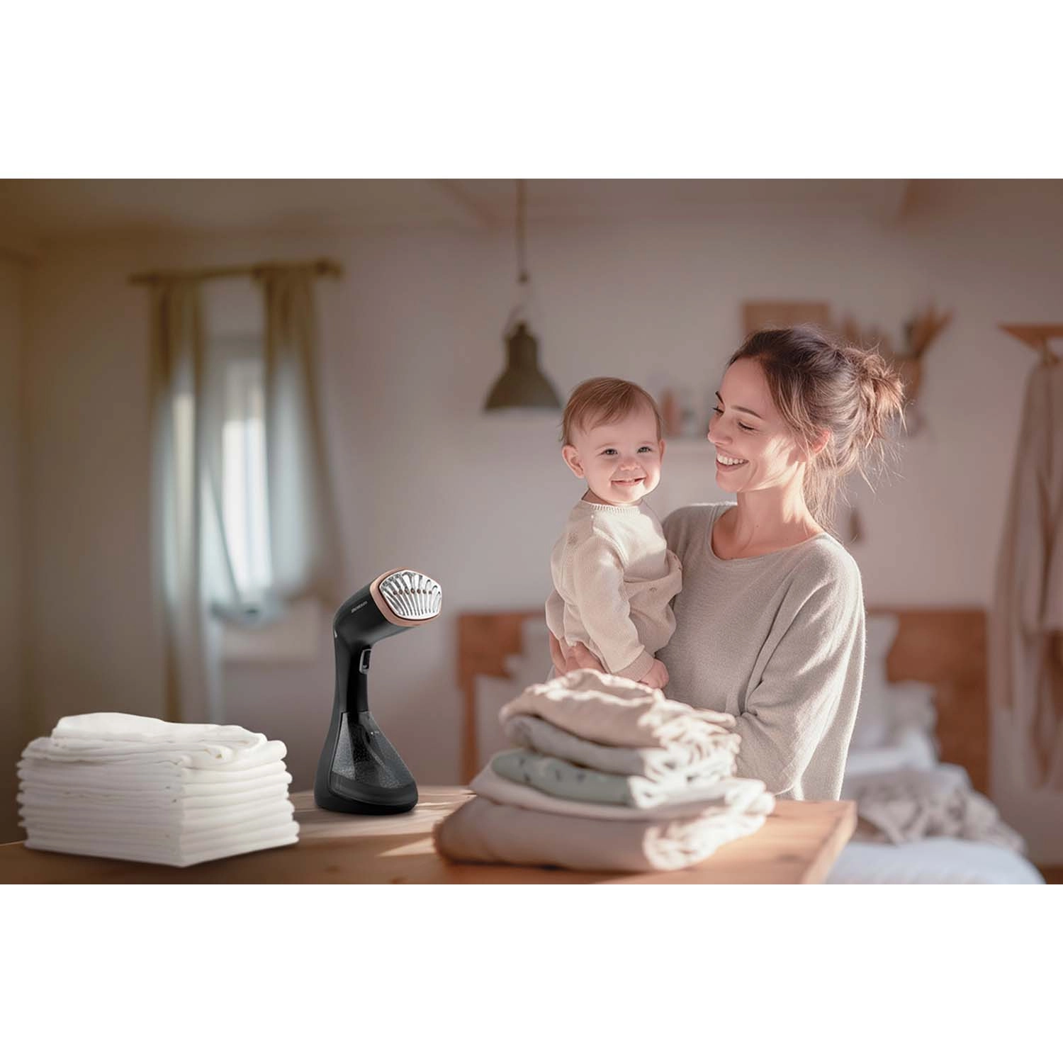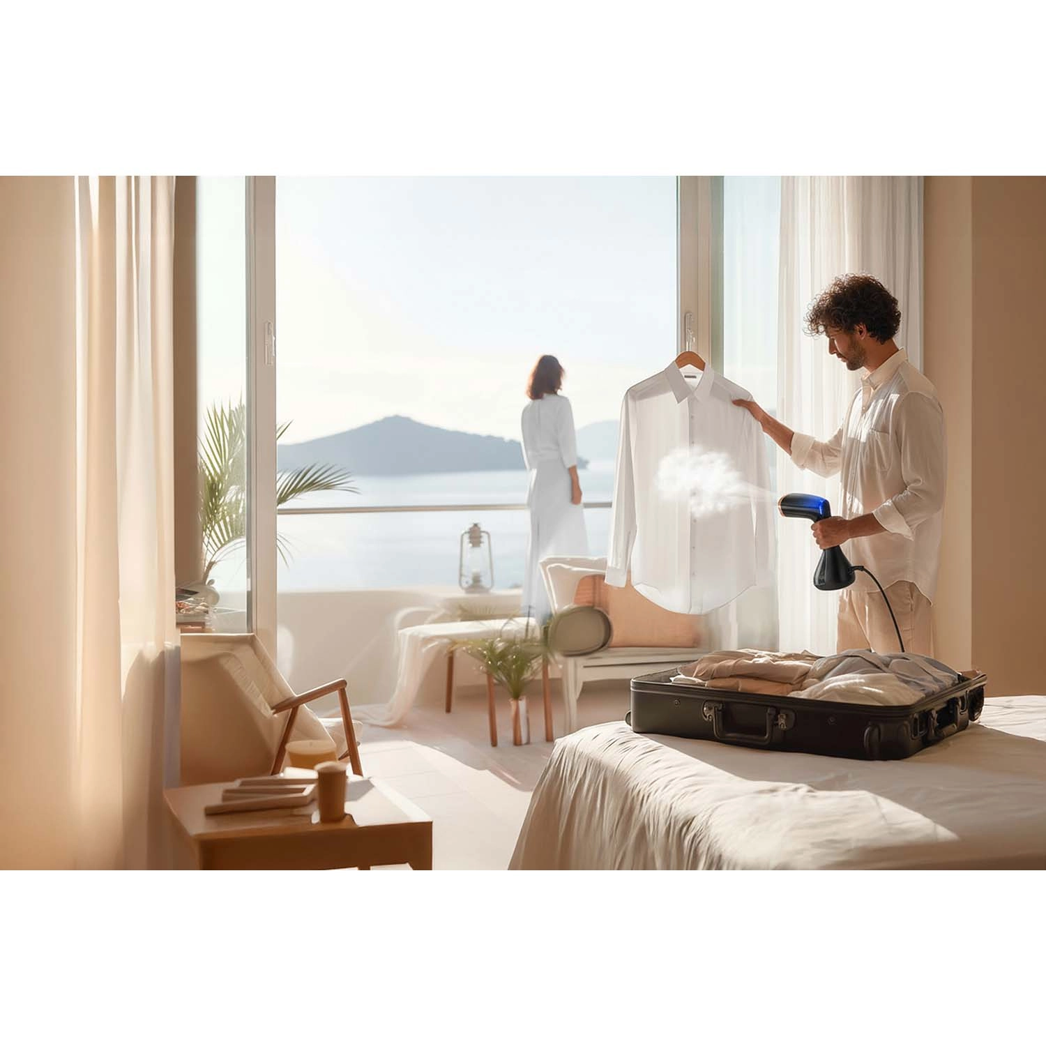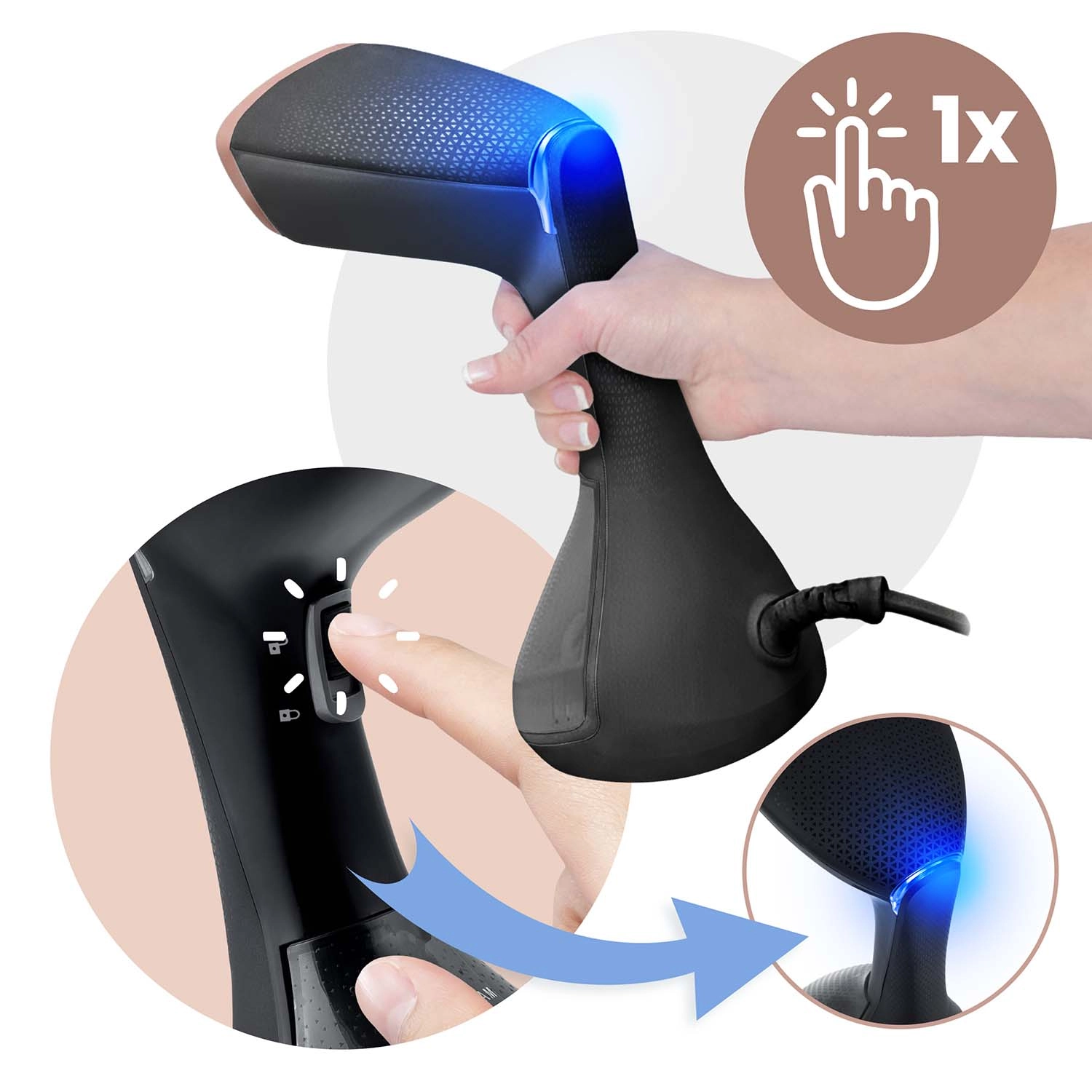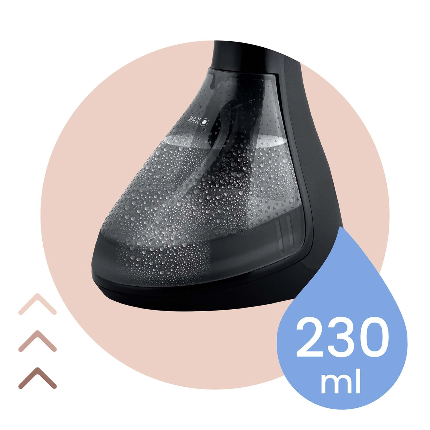 Átgondolt kialakítása kényelmet biztosít a mindennapi használatban és utazáskor is. A nagy, 230 ml-es, kivehető, úszós tartály lehetővé teszi a folyamatos gőzölést akár vízszintes helyzetben is, a 2 m hosszú kábel pedig bőséges mozgásszabadságot ad. Egyetlen gombbal indítható, és azonnal termeli a gőzt. A csomagban kefés feltét található az egyidejű gőzöléshez és szálak tisztításához, valamint egy praktikus töltőcsőr.