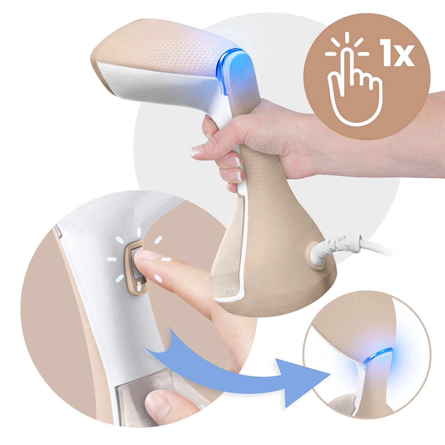 A nagy erejű gőzlöket gyorsan kisimítja még a makacs gyűrődéseket is ingeken, nadrágokon és ruhákon – vállfán, vasalódeszka nélkül.