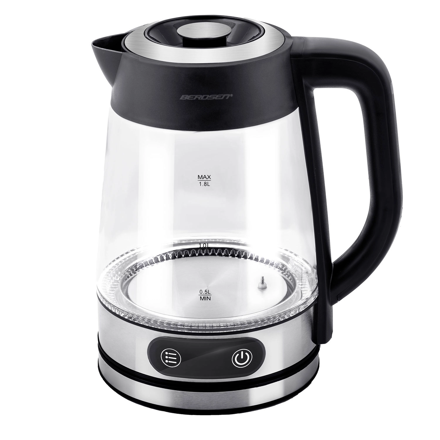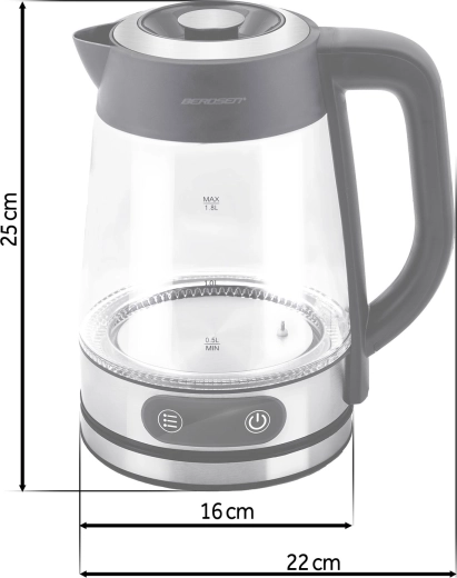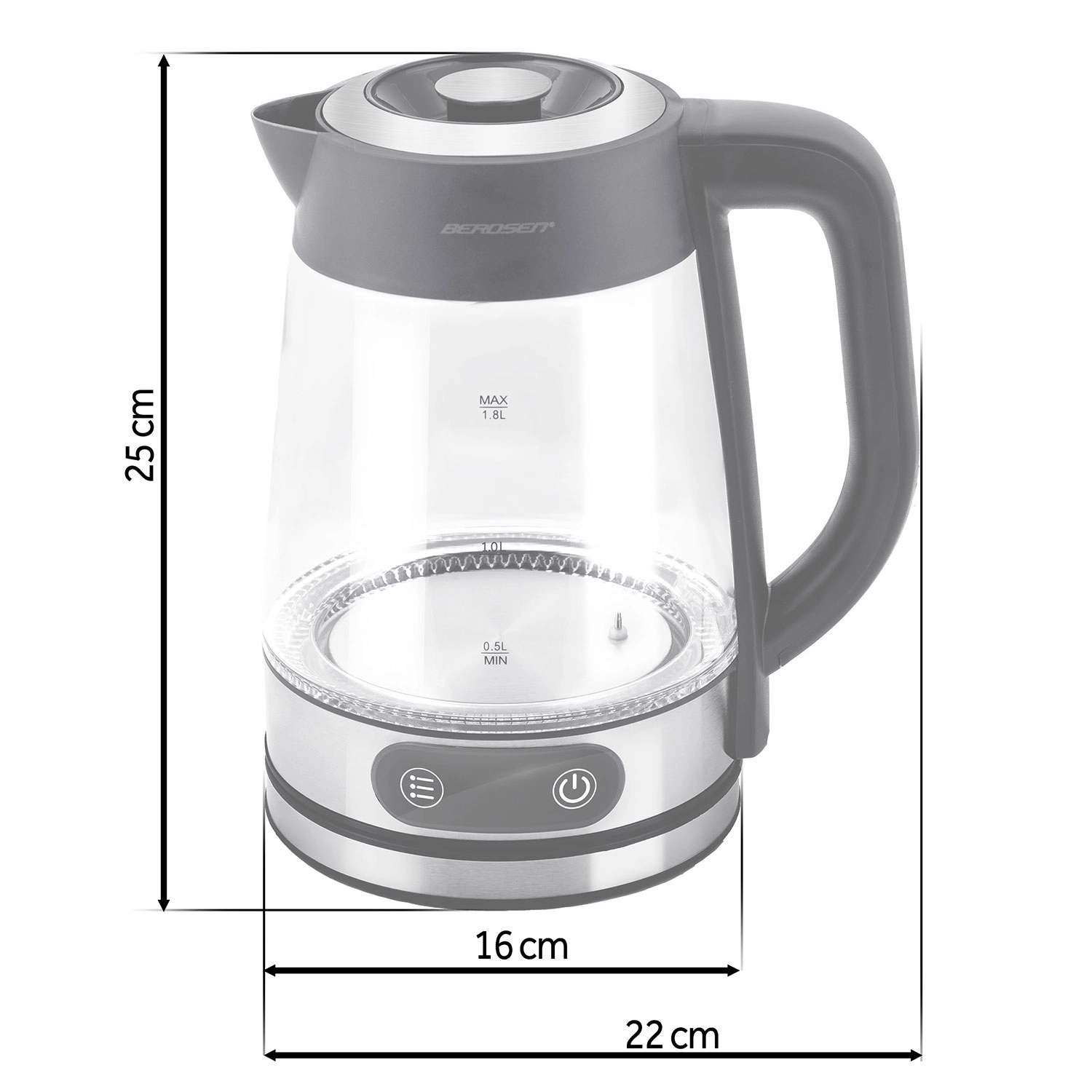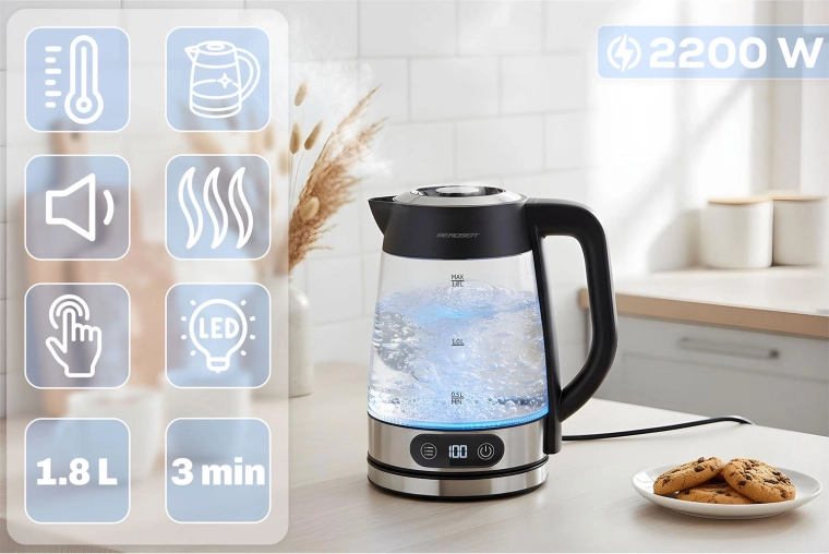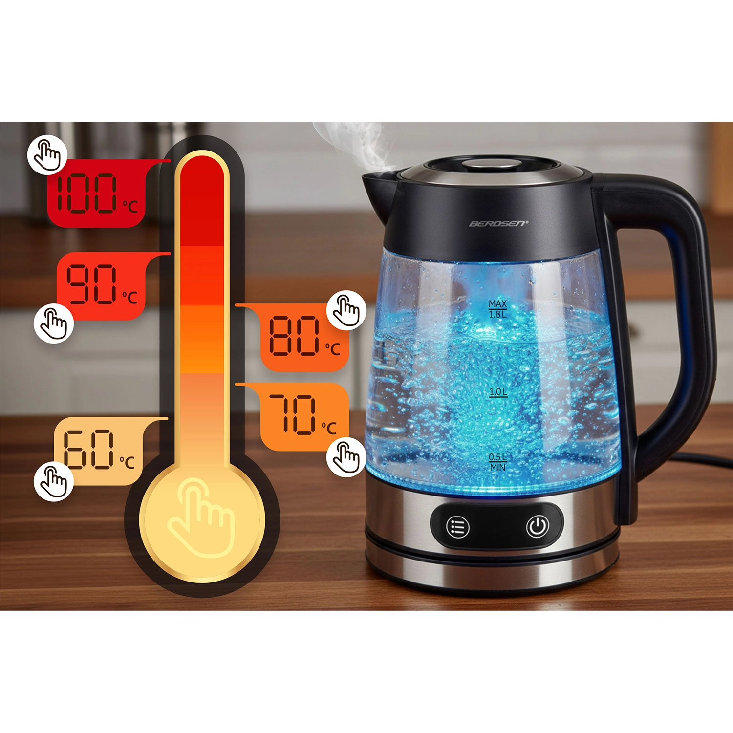 Elegáns BERDSEN üveg vízforraló 1,8 l űrtartalommal és 2200 W teljesítménnyel, 40–100 °C közötti hőmérséklet-beállítással a precíz vízmelegítésért. Az érintésvezérlésnek, a digitális kijelzőnek és a LED háttérvilágításnak köszönhetően a használat maximálisan kényelmes. A tartós boroszilikát üveg hosszú élettartamot és tisztább vizet biztosít, a Keep Warm funkció melegen tartja az italt, a szárazonfutás elleni védelem pedig biztonságot nyújt a mindennapi használat során.