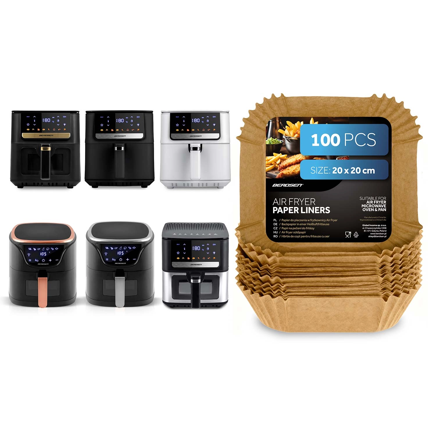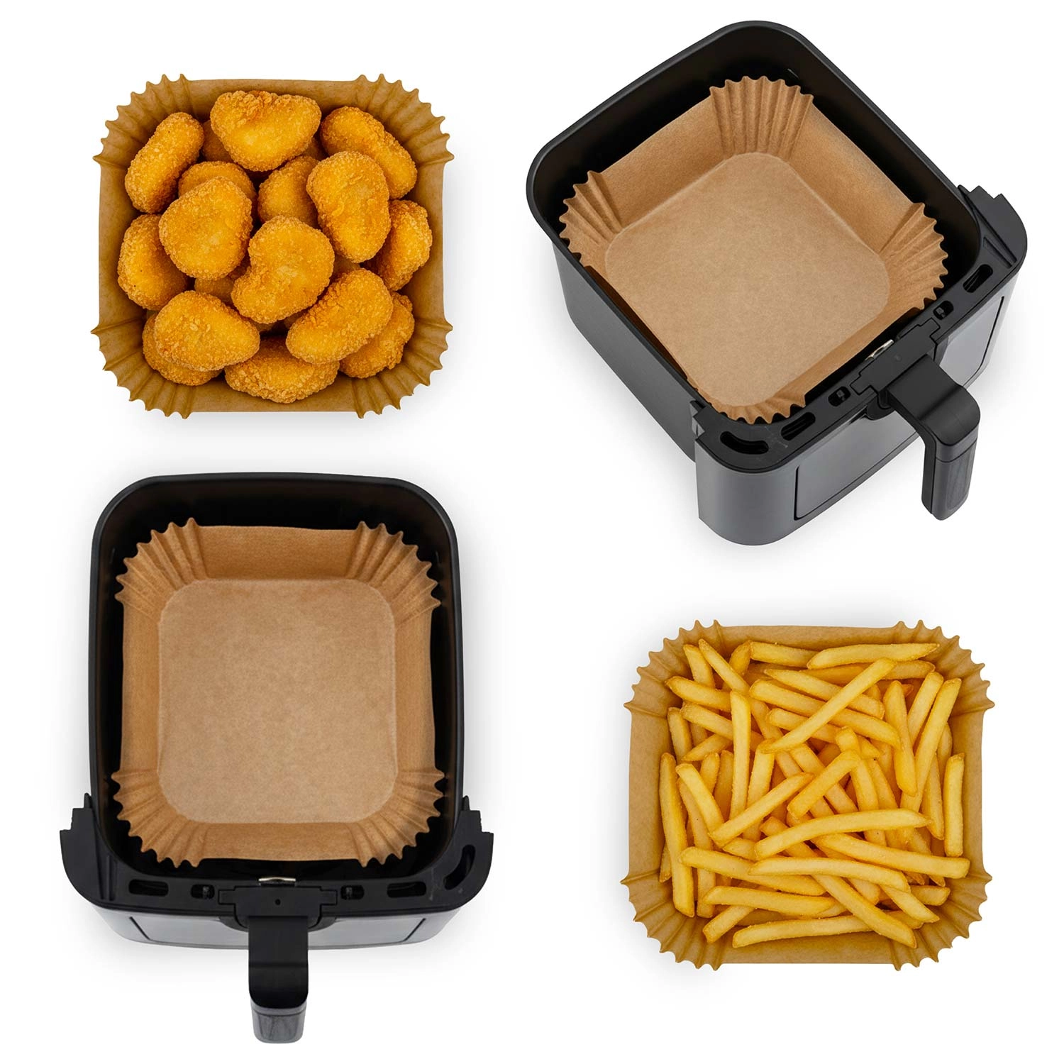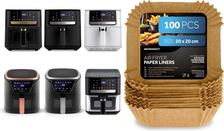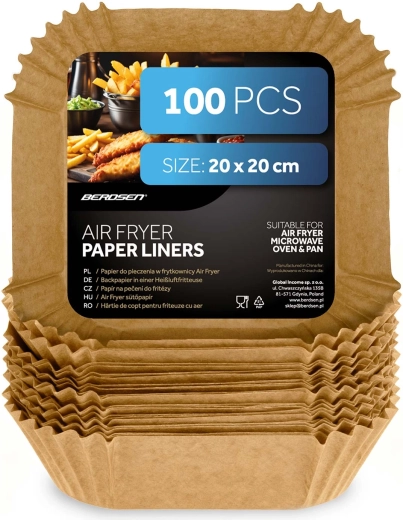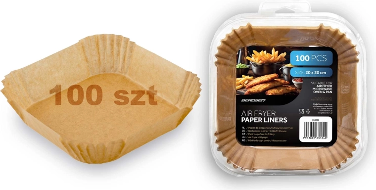 A 20 × 20 cm-es, négyzet alakú papírbetétek ideálisak forrólevegős sütőkhöz, de használhatók mikrohullámú sütőben, hagyományos sütőben vagy serpenyőben is. Az egyszer használatos kivitel és a tapadásmentes felület megkönnyíti az ételek kiemelését és higiénikusan tisztán tartja a készülékeket. Kiváló hasábburgonyához, csirkeszárnyhoz, nuggethez és pékáruhoz.