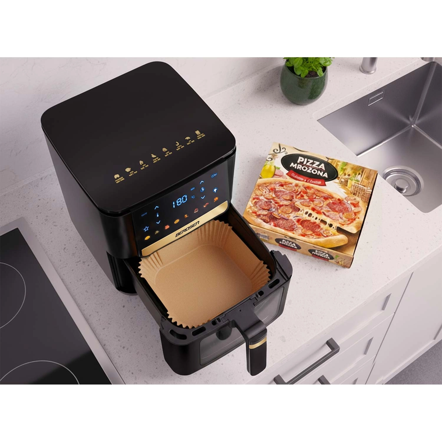A magas peremek és a zsírálló kialakítás felfogják a zsírt és a morzsákat, így főzés után elég a betétet kidobni, a kosár pedig szinte munka nélkül tiszta marad.