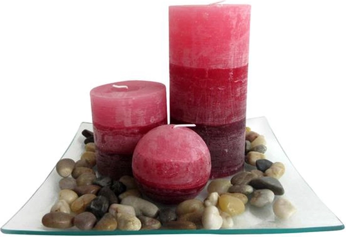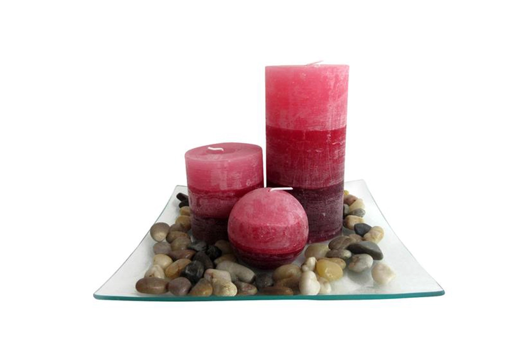 - Komplett dekoráció – 3 gyertya, üvegtálca és természetes kavicsok