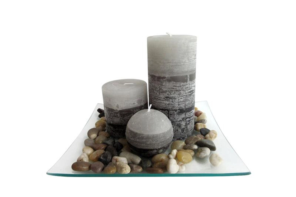 - Komplett dekoráció – a gyertyák, az üvegtálca és a kövek együtt kész kompozíciót alkotnak.