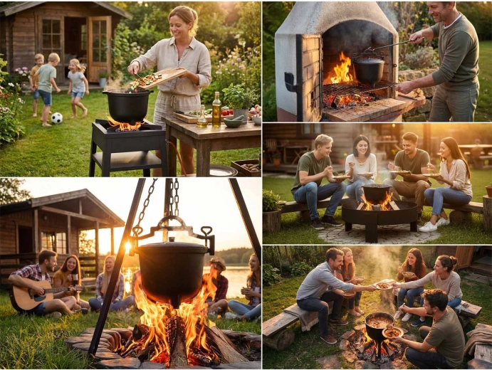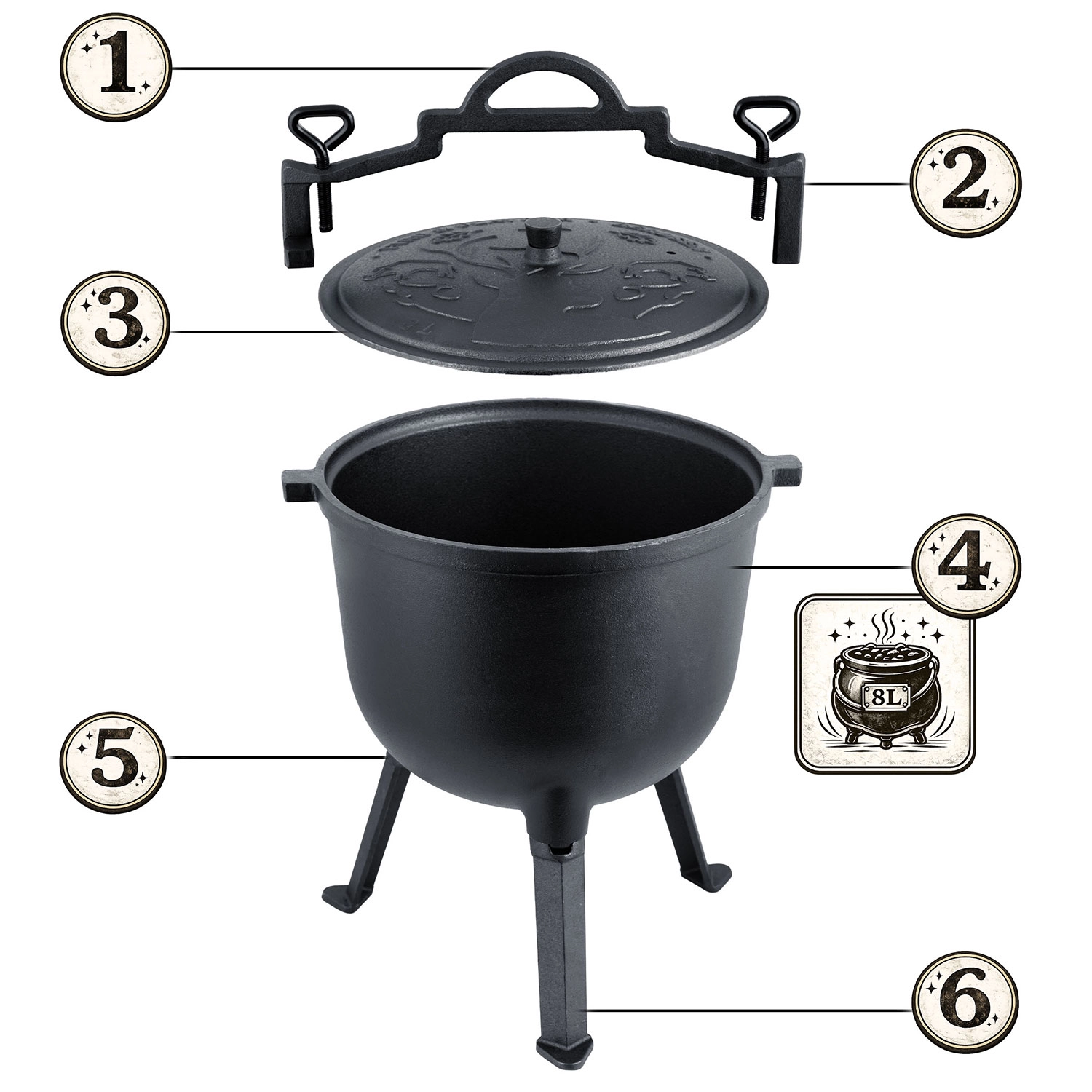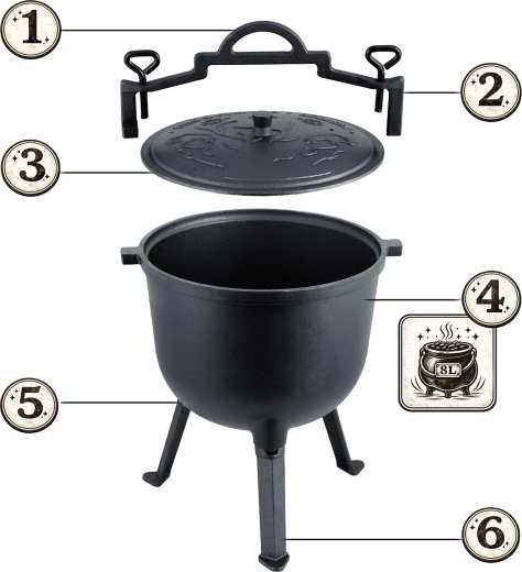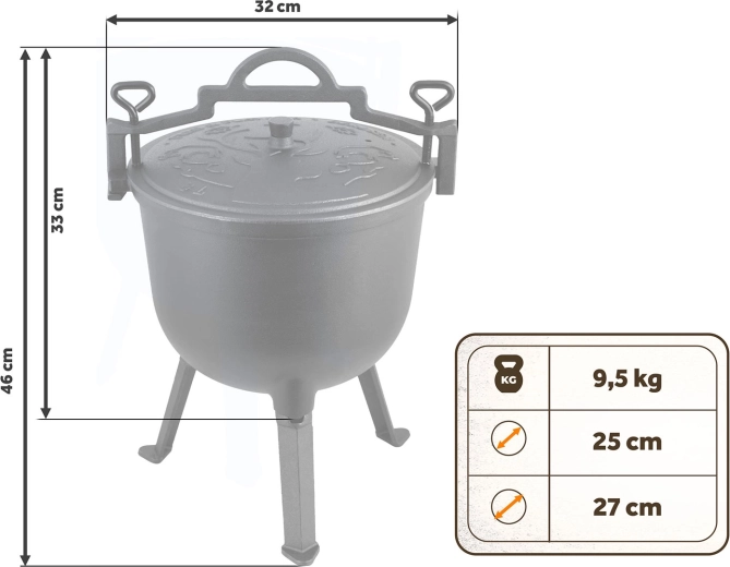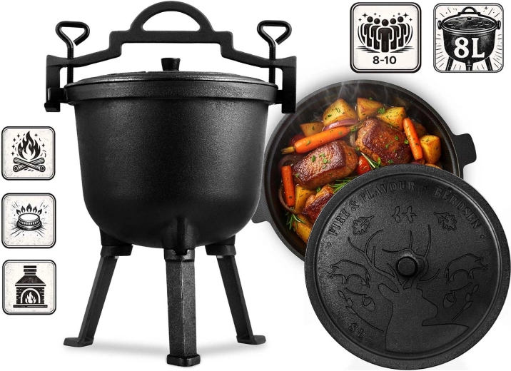 A nagy, 8 literes űrtartalom jóllakatja a családot és a barátokat. Remekül működik nyáron a grillnél és télen a tűznél is – pörkölthöz, sült ételekhez és tartalmas levesekhez.