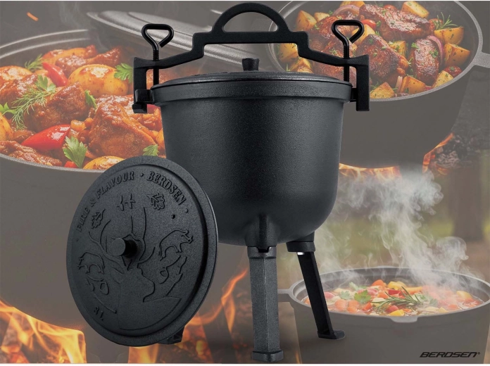 A hagyományos, 8 literes öntöttvas üst ideális tűzön, kandallóban és grillen történő főzéshez. A masszív öntöttvas kiválóan tárolja és egyenletesen adja át a hőt az aljától egészen a fedőig, így az étel lassan rotyog, és intenzív, becsületes ízt kap. A vastag falak megakadályozzák az odakapást, és nagyon sokáig tartják a hőt.