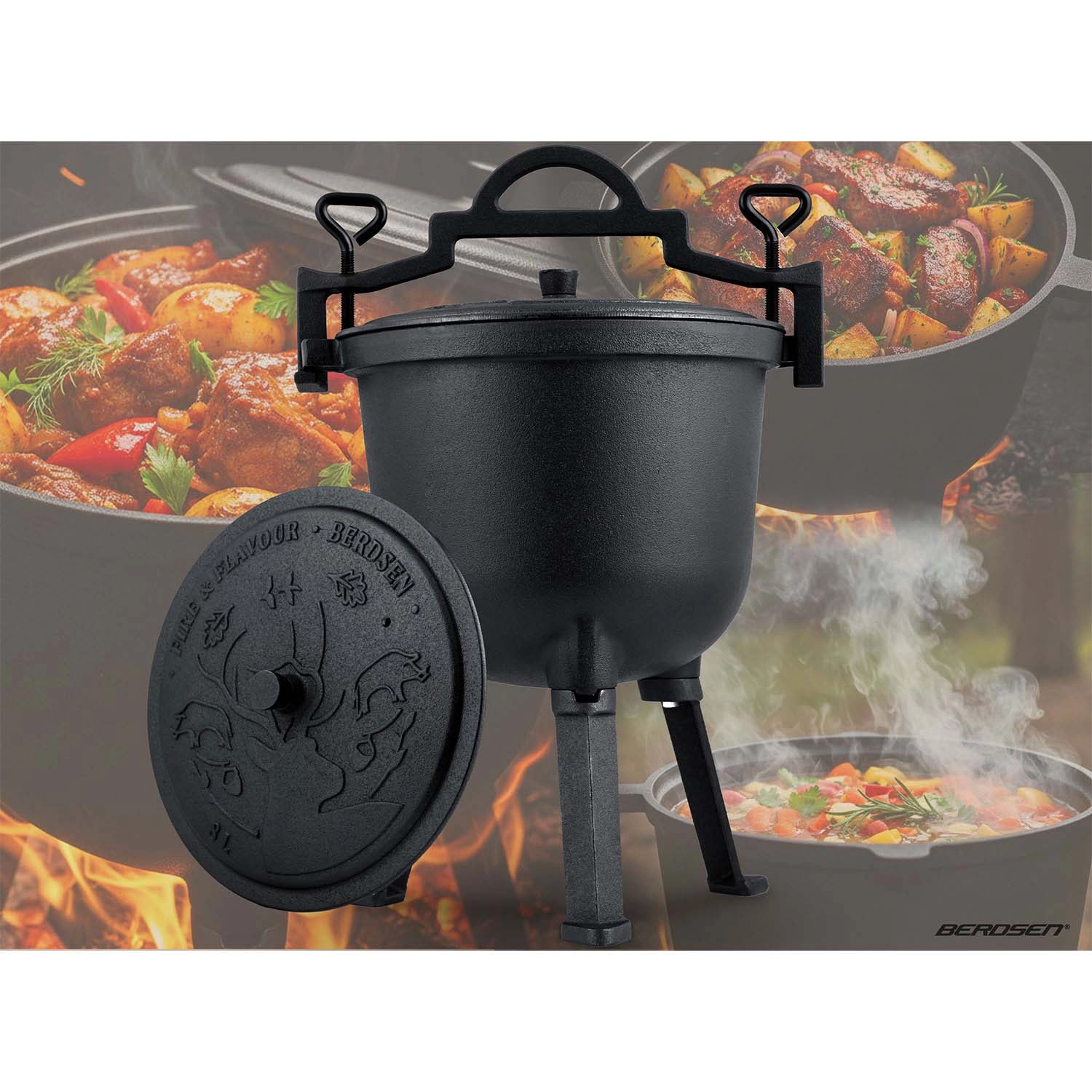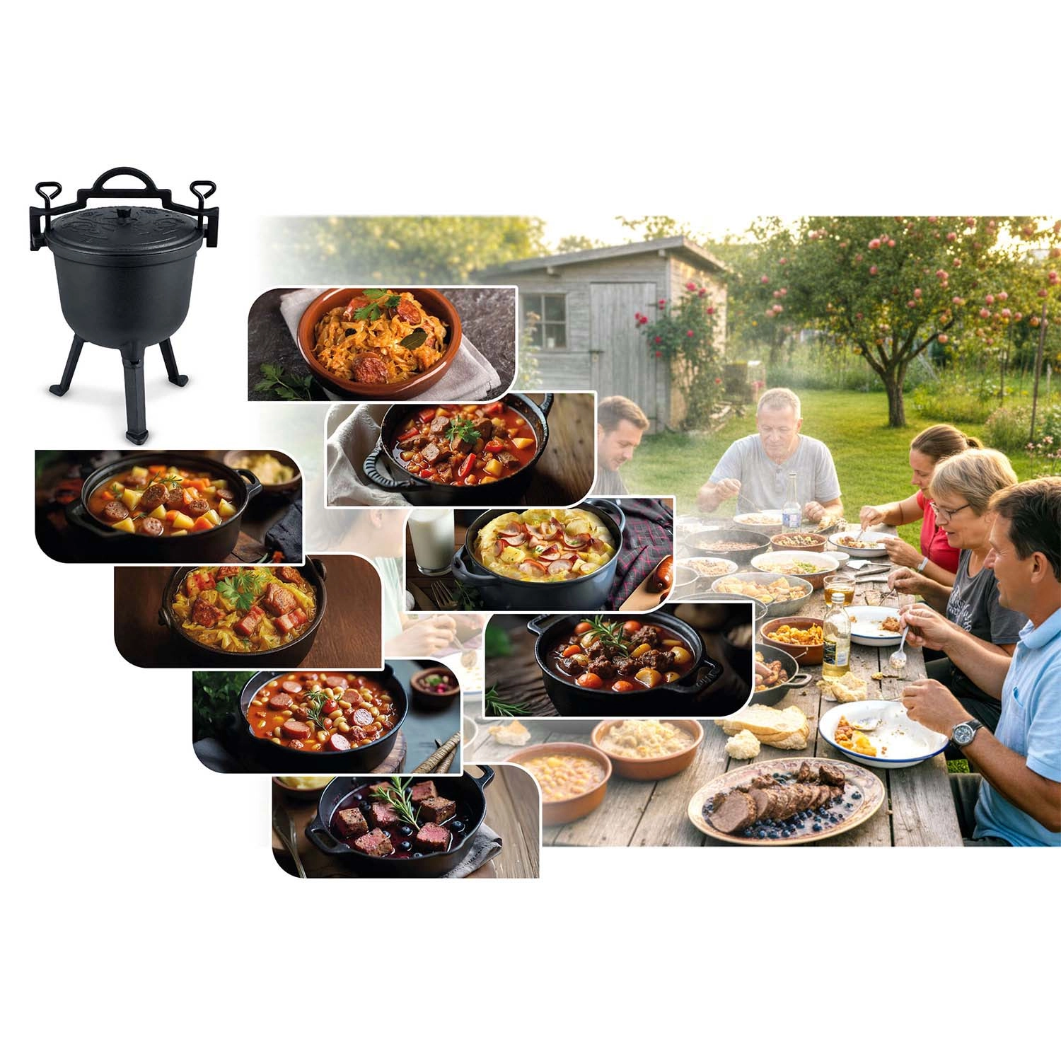 A csavarozható lábak és a masszív fogantyú lehetővé teszik, hogy az üstöt biztonságosan tűzhelybe állítsa vagy láng fölé akassza – a kertben, kempingben vagy a nyaralónál.