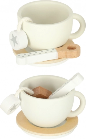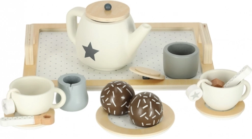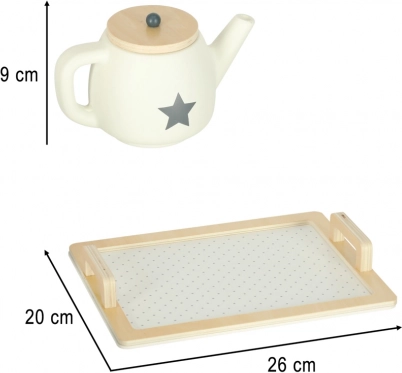 Elegáns, semleges színű fa tea készlet csillagos részletekkel – ideális gyerek teadélutánokhoz. A gyerekek teát, tejet és „desszertet” is felszolgálhatnak, gyakorolhatják az udvariasságot és a kommunikációt, miközben fejlődik a képzelőerejük.