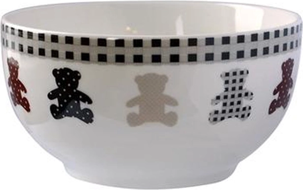Stílusos fehér tálaló tálka bájos medvemintával, amely a gyerekeknek és felnőtteknek egyaránt örömet szerez. Mindennapi használatra praktikus – mikrohullámú sütőben használható és mosogatógépben mosható. 500 ml űrtartalmával és kompakt 13 × 6,5 cm méretével ideális levesekhez, gabonapelyhekhez, desszertekhez és uzsonnákhoz.