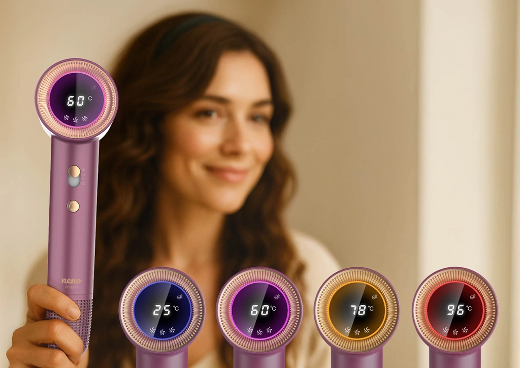 A Neno Beauty Silvia a modern technológiát a mindennapi kényelemmel ötvözi. A fejlett ionizációnak köszönhetően megszünteti a statikus elektromosságot, lezárja a kutikulát, és sima, fényes hajat hagy maga után. Az intelligens szenzor másodpercenként akár 100-szor felügyeli a hőmérsékletet, így védi a hajat a túlmelegedéstől és a károsodástól. A színes gyűrűvel ellátott LED-kijelző egy pillantással áttekinthetően mutatja a hőmérsékletet és a légáramlási sebességet, így teljes kontroll alatt tarthatod a formázást.