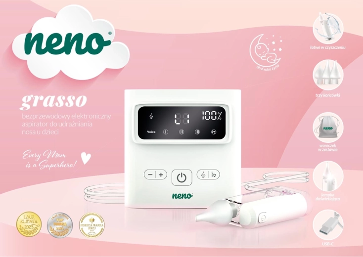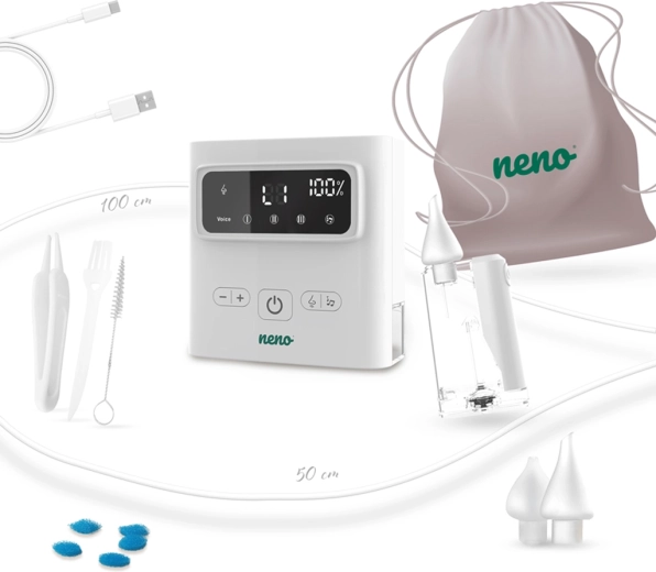 A vezeték nélküli működésnek, az USB‑C töltésnek és a kompakt méreteknek köszönhetően a Neno Grasso utazáshoz is ideális. A doboz teljes tartozékkészletet kínál, beleértve a védőtokot, csöveket, szűrőket és tisztítóeszközöket – mindent, amire szüksége van a biztonságos, kényelmes használathoz újszülött kortól 6 éves korig.