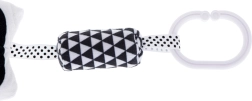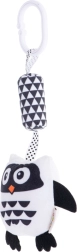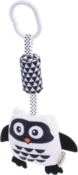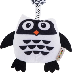A függő játék bagoly formájú és puha, kellemes anyagból készült, a legkisebb gyermekek igényeihez igazítva. A csipesz biztosítja a könnyű rögzítést a babakocsira, kiságyra vagy hordozóra. A különféle felületi textúrák révén a játék érintésére ösztönzi a gyerekeket. A csörgő és rezgő elemek hallásra ösztönöznek, míg a kontrasztos árnyalatok alkalmazása látásra serkent. A fekete-fehér dizájn a legjobb választás a csecsemőknek, akiknél még nem fejlődött ki teljesen a látás.