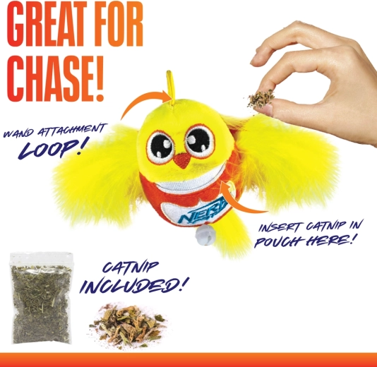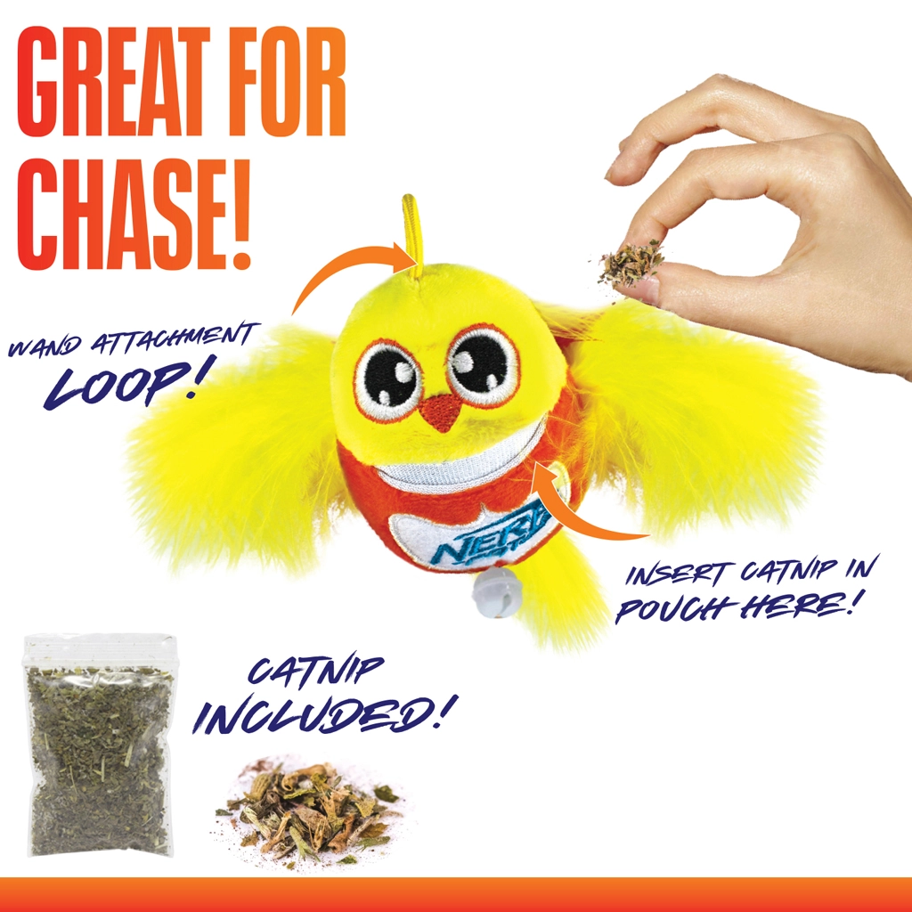 Lepje meg cicáját a valósághű, interaktív NERF CAT játékkal. A puha plüss madárka tollakkal vagy bojtokkal a pálca lengetésekor természetesen mozog, és a csengővel együtt a látást és a hallást is stimulálja. A mellékelt tasak macskamentával növeli a motivációt és meghosszabbítja a játékidőt.