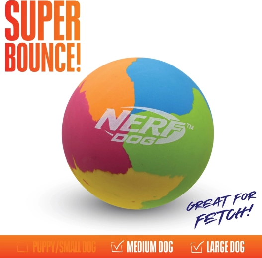 Szórakozás aktív kutyáknak a NERF DOG Super Bounce labdával, 9,5 cm átmérővel. A tartós, magas pattogású gumi dinamikus és kiszámíthatatlan visszapattanást biztosít, amely futásra és apportírozásra ösztönzi a kutyát. A élénk színek növelik a láthatóságot fűben és parkban is, a könnyen tisztítható felület pedig megkönnyíti a karbantartást.