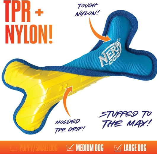 Egy szórakoztató és tartós játékot keres aktív kutyáknak? A NERF DOG 28 cm-es csont erős TPR magot és puha plüss nejlont kombinál a kényelmes rágáshoz, húzáshoz és apportírozáshoz. A élénk, jól látható színeknek köszönhetően kint is könnyen megtalálható, strapabíró kialakítása pedig ideális közepes és nagy testű fajtáknak.