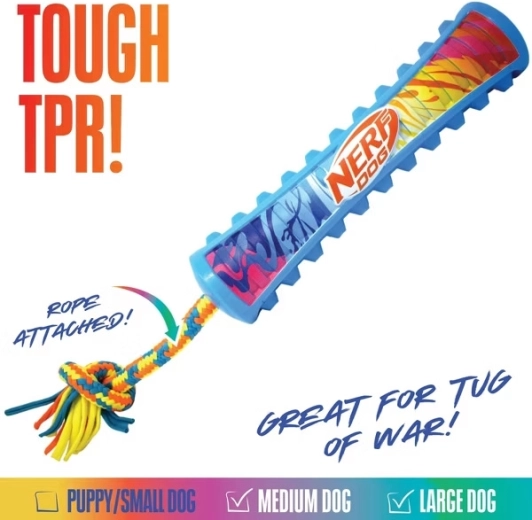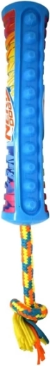 A NERF DOG játék tartós gumitestet kombinál fonott kötéllel huzigáláshoz, apporthoz és önálló rágcsáláshoz. A texturált felület kiváló tapadást biztosít, míg a síp hosszabb, aktívabb játékra motivál. Feltűnő színeinek köszönhetően a fűben is könnyen megtalálható.